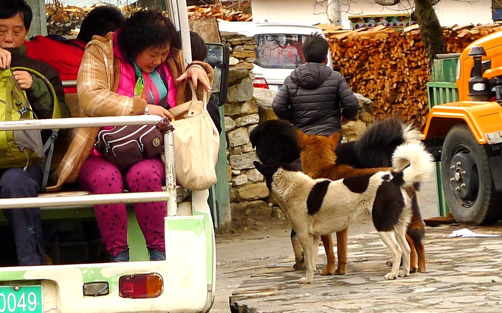 “桃花源”中一片寂静,在我们逗留的约50分钟内,除曾遇到两位行走的路人,就再没见到过半个人影。然而,公路上的牛、猪却是一群又一群,它们都没人跟随,而且都是朝着一个方向行走,我猜想应该是在村外觅食以后回家午休。有一扇紧闭的大门外面聚集众多牛、猪,可能是主人未归,返家的牲畜都只能守候在门外。在这座小村“艳遇”桃花是我们七日包车之最难忘经历,不但桃花开得旺盛,而且好似只为我们两人而开。