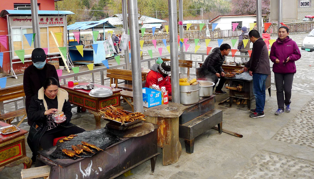 11:53走到木栈道终点,找到我们的交通车,司机却是并不着急,车上也不见人。此处有众多摊贩,团友们都在逛市场,X.J.买了两串烤鱼、两串烤藏香猪肉与我分享,他说此时若不品尝一下,今后恐怕再难有机会。烤鱼就是南伊河中的野生鱼,感觉蛮好吃,我在“琼林珞巴民俗文化广场”就曾看到有人将捕获的河鱼拿来出售,要价40元/斤。我刚把鱼、肉吃完,司机就张罗着要大家上车,我催促X.J.抓紧,他却是把没吃完的半条鱼扔掉,让我觉得很是可惜,其实,带上车吃也并无妨。