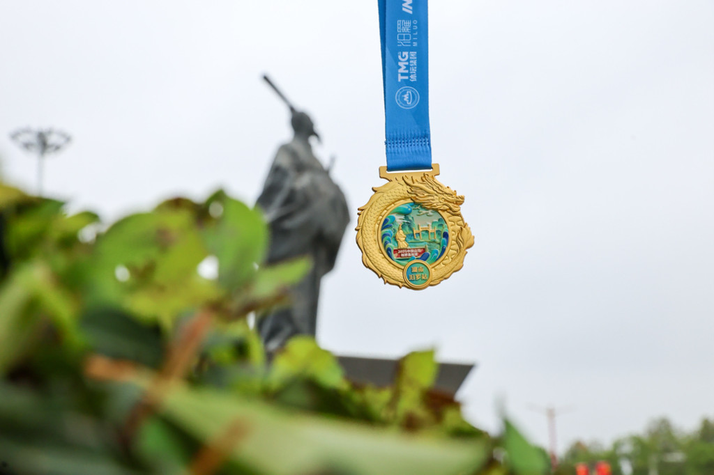 而完赛奖牌,更是此次赛事递给选手的一张“文化名片”。其以“人文与山水交融,体育与文化共鸣”为设计核心,每一处细节都藏着汨罗的独特印记。奖牌背景处,流动的水纹缓缓铺开,既是赛道旁汨罗江的诗意缩影,让人想起奔跑途中与江水相伴的惬意时光;又暗合屈原笔下“沧浪之水”的文化意象,仿佛千年前的文人情怀与如今的体育精神在此刻交汇,诉说着历史长河与体育激情共流淌的深远意境。奖牌中央,屈原昂首远眺的雕塑形象以浮雕形式呈现,他身姿挺拔,目光坚定,仿佛仍在探寻理想的道路,这恰与“路漫漫其修远兮”的求索精神相契合。而这份不畏艰难、执着向前的精神,又与越野跑者们在赛道上不畏险阻、勇攀高峰的信念完美呼应。每一位完赛选手手握这枚奖牌,握住的不仅是对自己的肯定,更是对汨罗文化精神的传承。