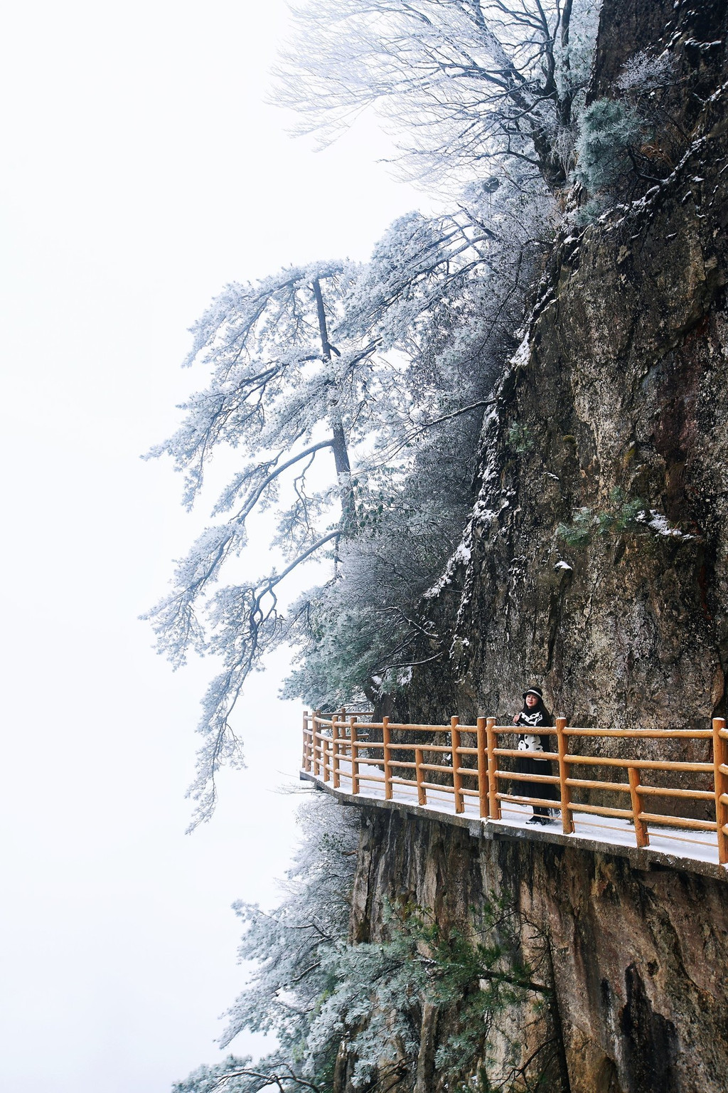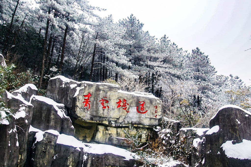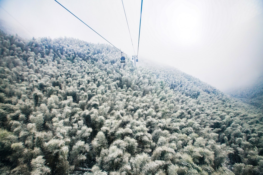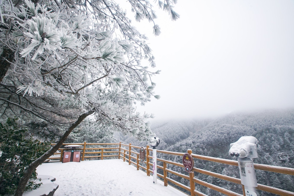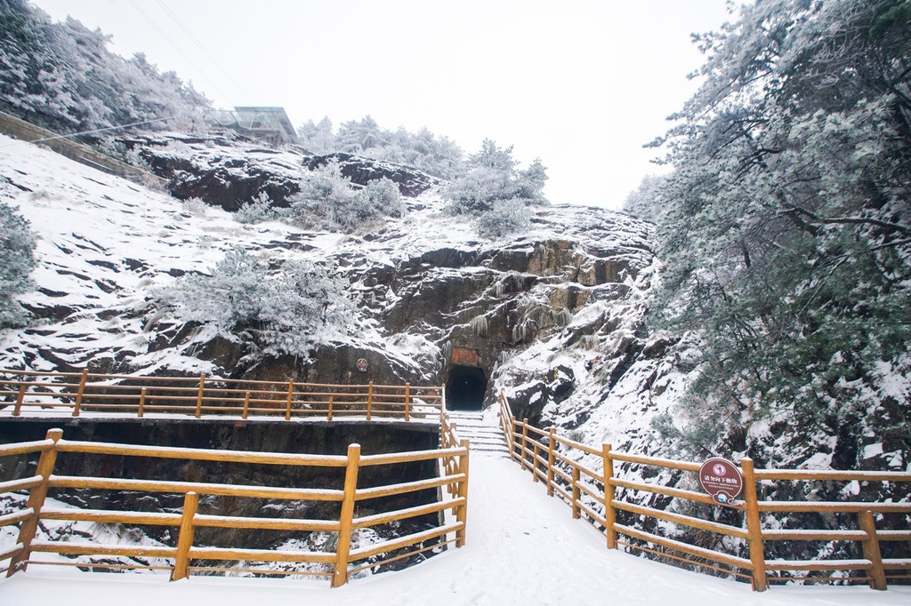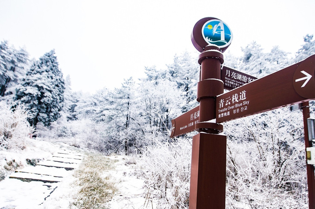 大雪上山栈道关闭,于是缆车坐到山顶,因为积雪未除观光车暂没开,一路赏景步行半小时到青云栈道,开始了今天的奇幻冰雪之旅。