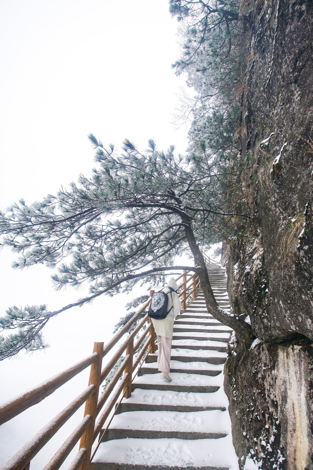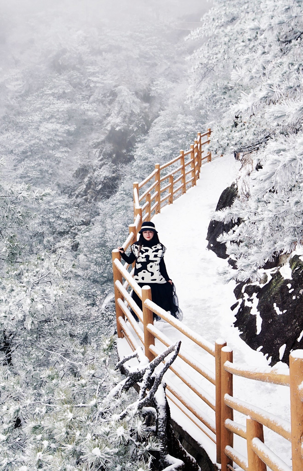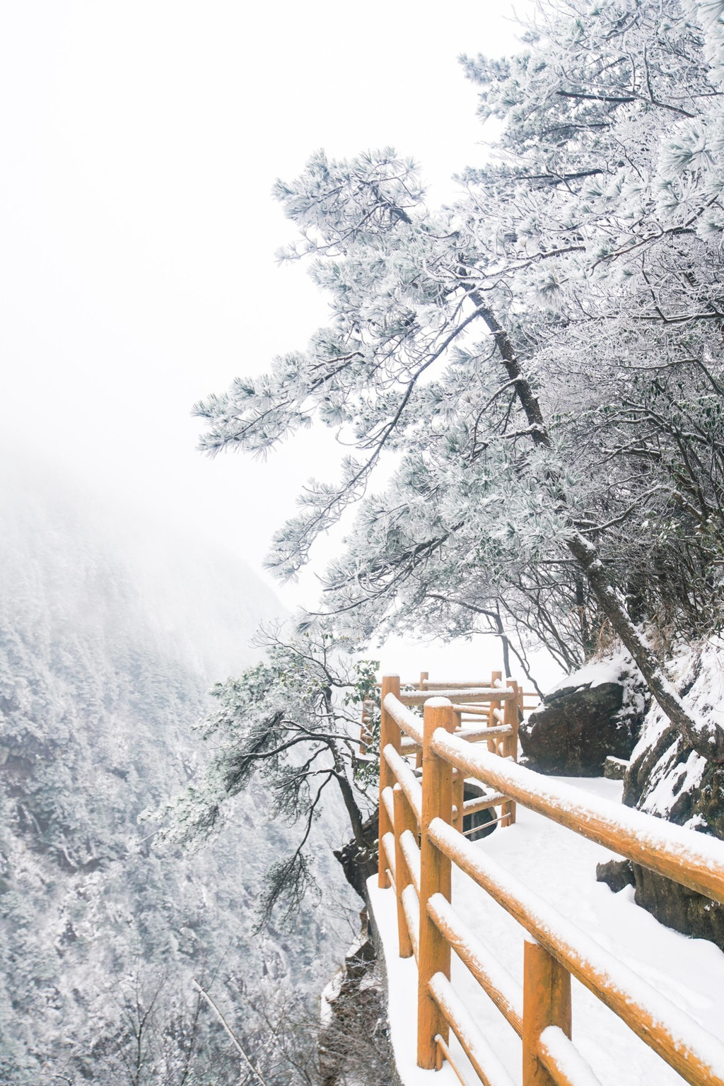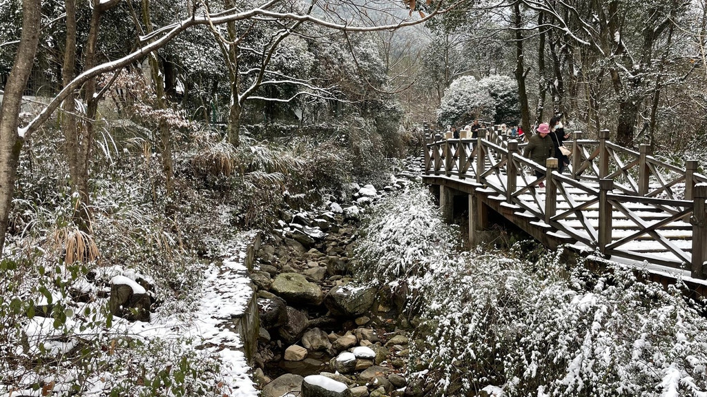 大雪上山栈道关闭,于是缆车坐到山顶,因为积雪未除观光车暂没开,一路赏景步行半小时到青云栈道,开始了今天的奇幻冰雪之旅。