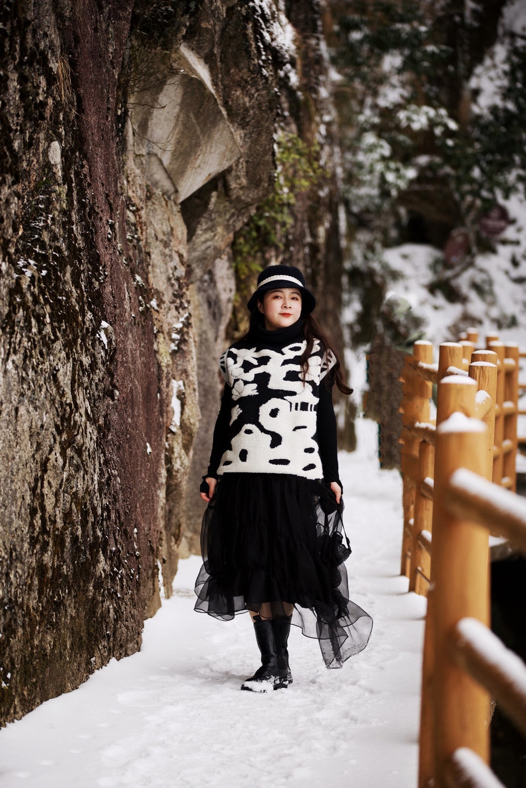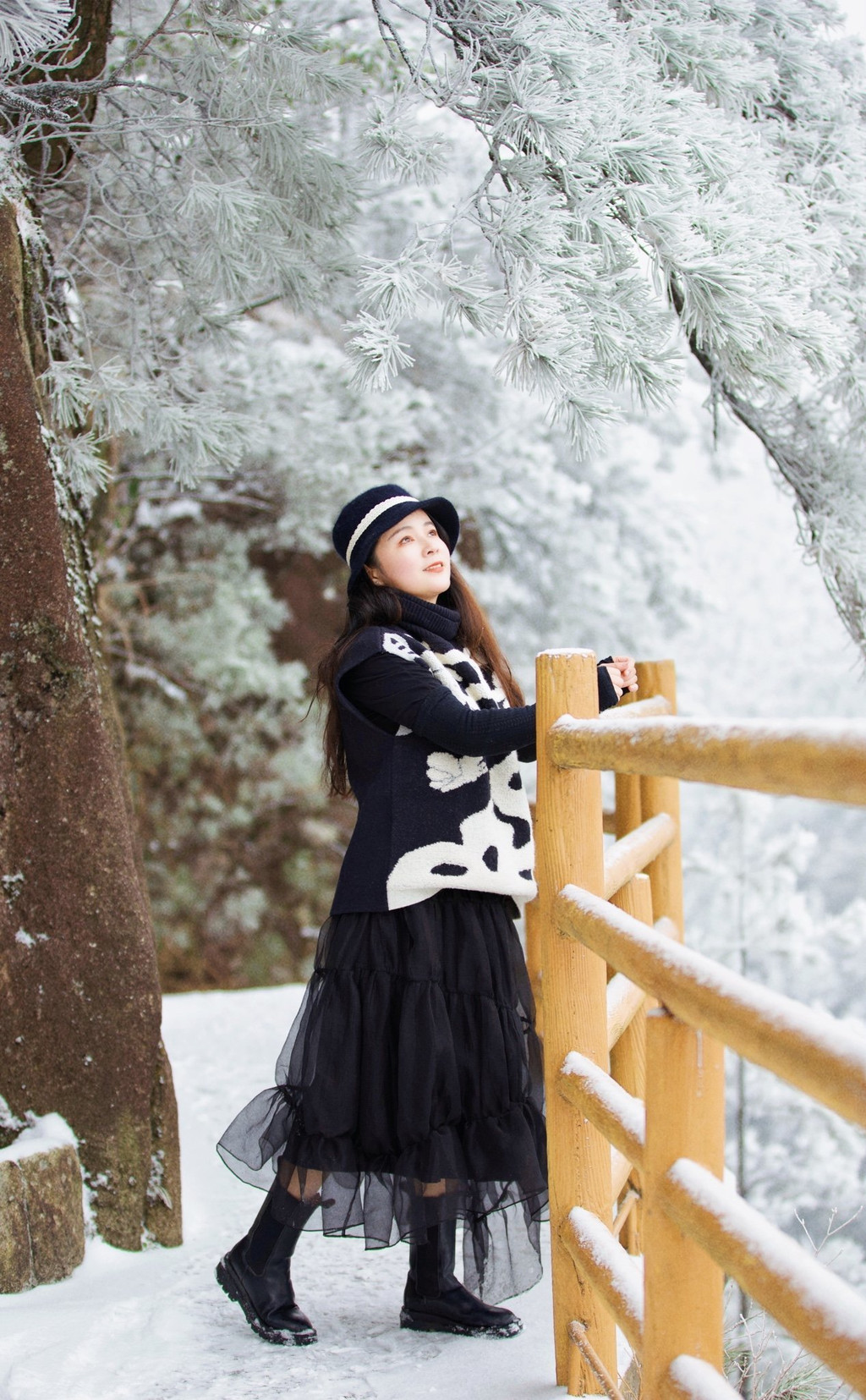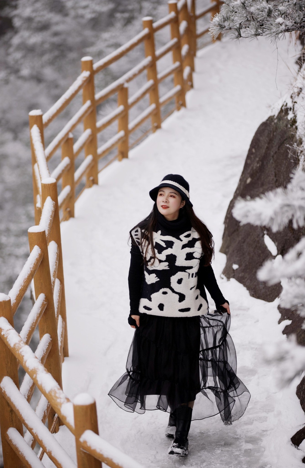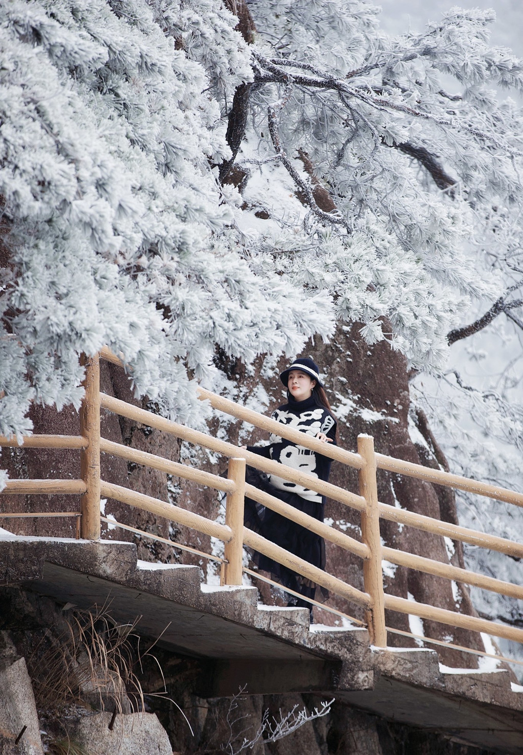 大雪上山栈道关闭,于是缆车坐到山顶,因为积雪未除观光车暂没开,一路赏景步行半小时到青云栈道,开始了今天的奇幻冰雪之旅。