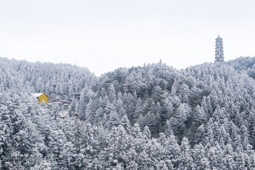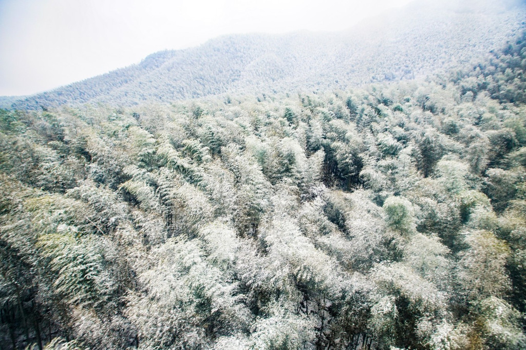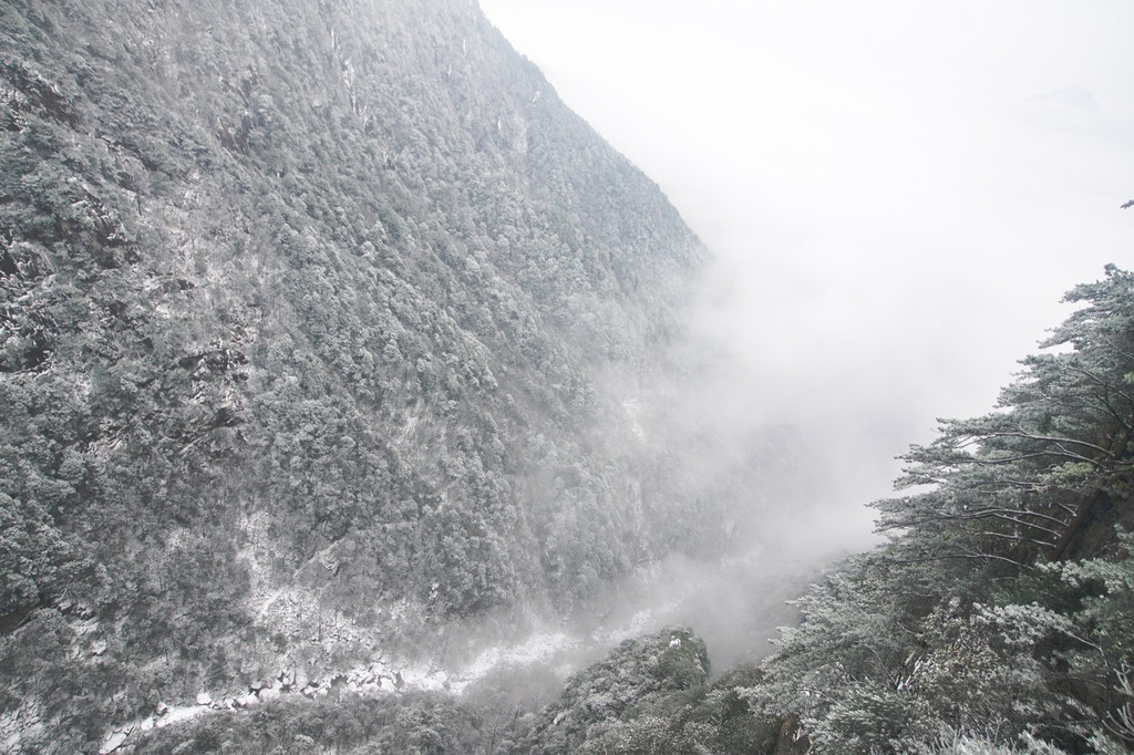 下行穿过长长的岩洞,出来就是豁然开朗,扑入眼帘的是一个银白的世界,远方雪峰杉林遮蔽得若隐若现;山峰也被白雪覆盖了,像一个个“雪巨人”;