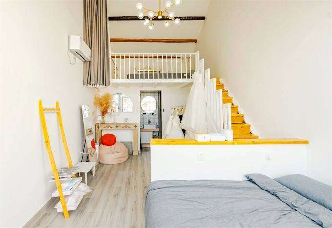 loft家庭房房间内有独立卫生间,干湿分离,客房内有婚纱,可以免费试穿拍照。