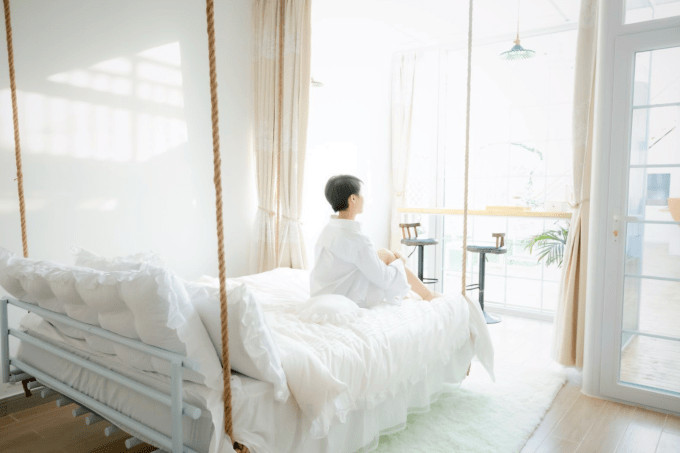 卧室设计风格清新美观,落地窗、吊床、阁楼等元素齐全,拍照打卡胜地,干净整洁。
