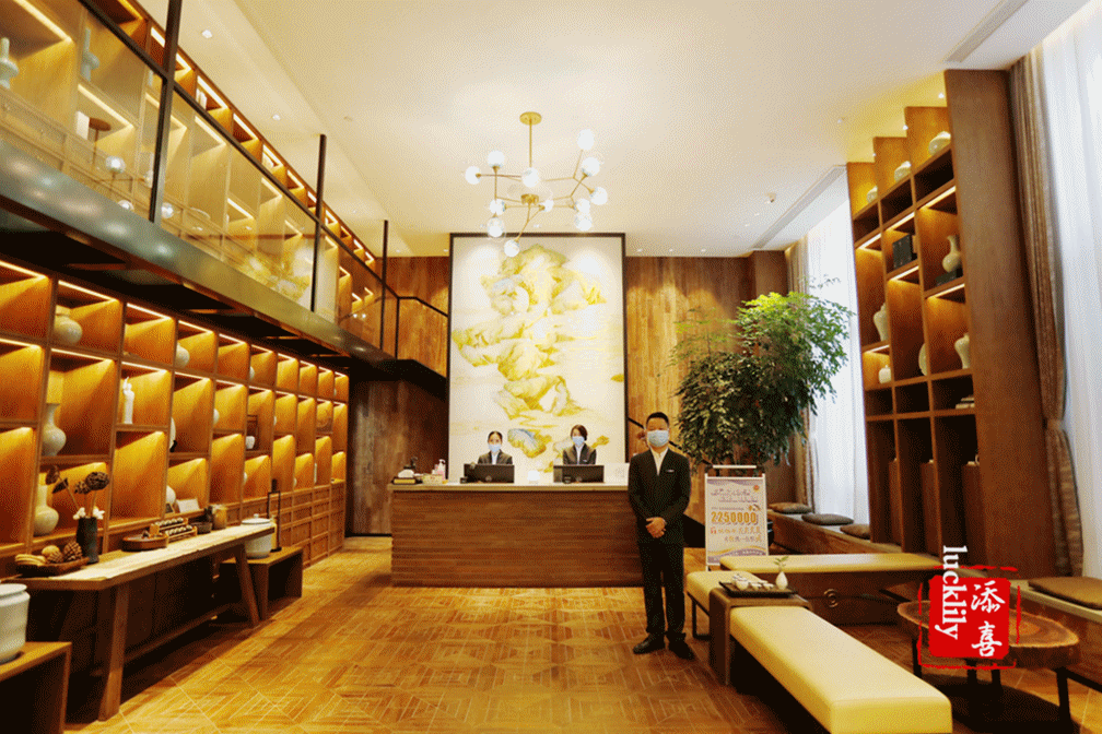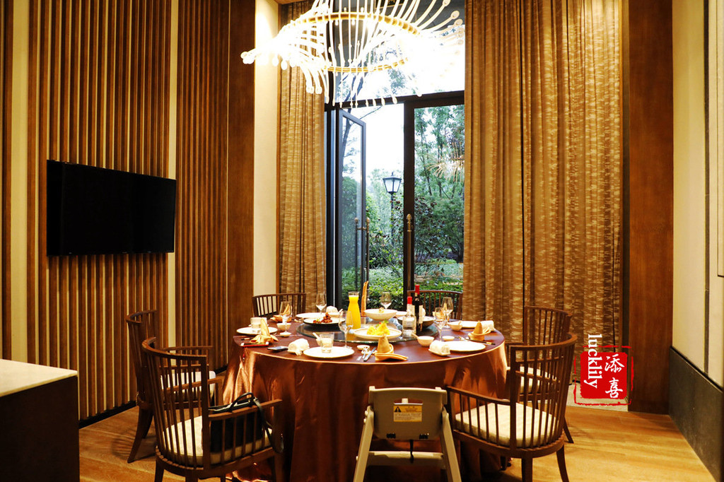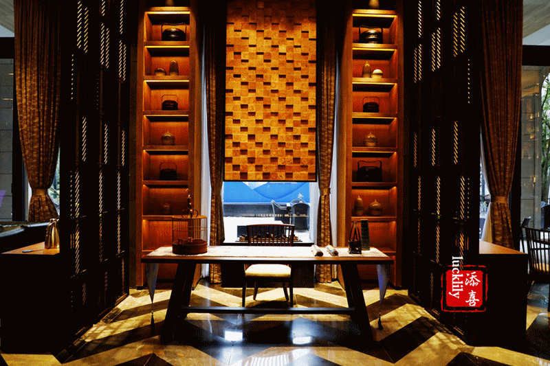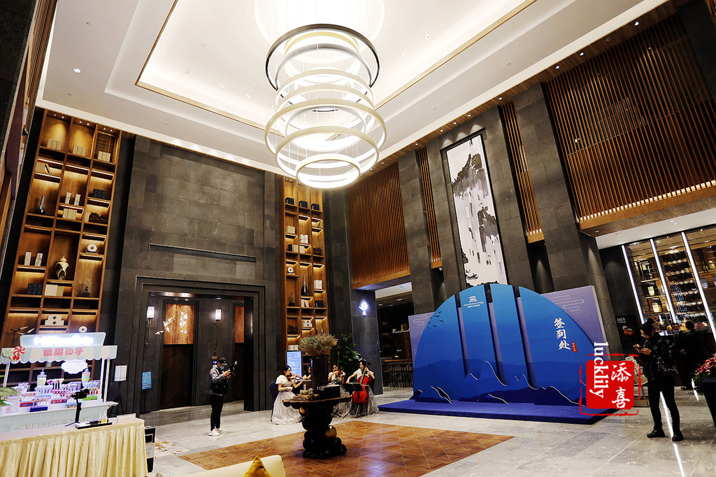 酒店及周边的住宅均为欧式建筑,酒店门前呈U型的欧式主题花园结构,酒店位于U型之心,两侧分别是各类商超和餐饮。酒店门庭高阔,入内后别有洞天,大厅设计完全以中式古风为重,有着厚重的书香气息。书画、盆裁、木雕、茶艺等中国文化精髓的载体在此相得益彰的完美呈现。前台另设在边厅,热毛巾、茶水、手工小食精致备侯,工作人员谦和有礼,业务办理过程优雅娴熟。