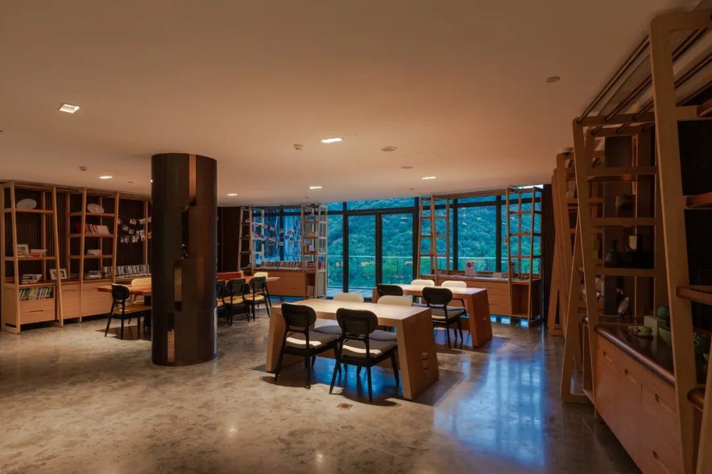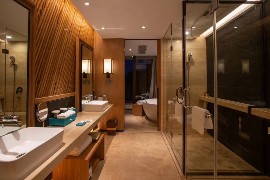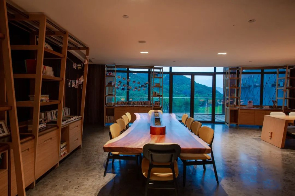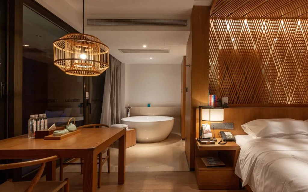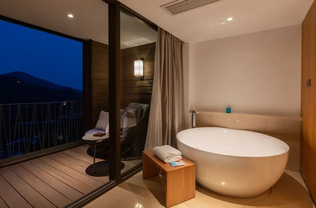 宽大的方桌可以在这打开电脑展开短暂的工作,而舒适简约的长沙发,也比较适合慵懒地依靠在这看书发呆;超大的圆形浴缸,可一边泡澡,一边欣赏山野美景。