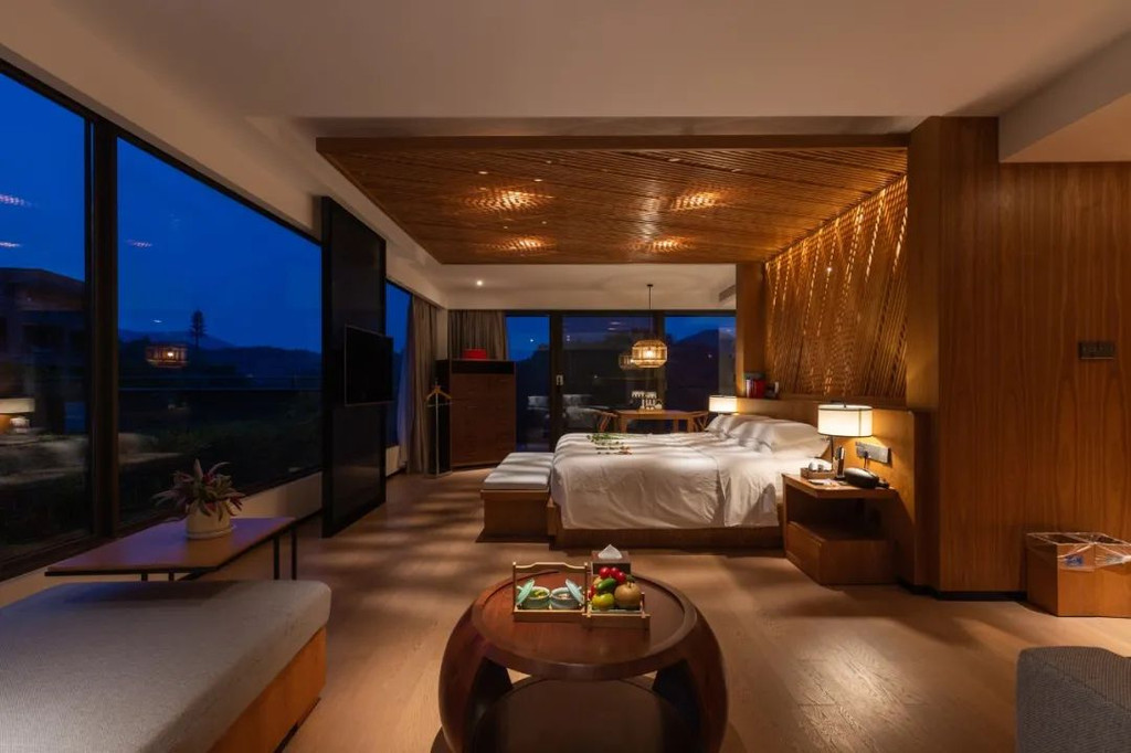 入住看得见风景的房间,身心浸润于自然的静谧歇息之所。本次入住的是怀山庐客房区的空中花园大床房。客房装修以北欧木结构为别墅主体,室内空间通透自然,现代设施一应俱全。