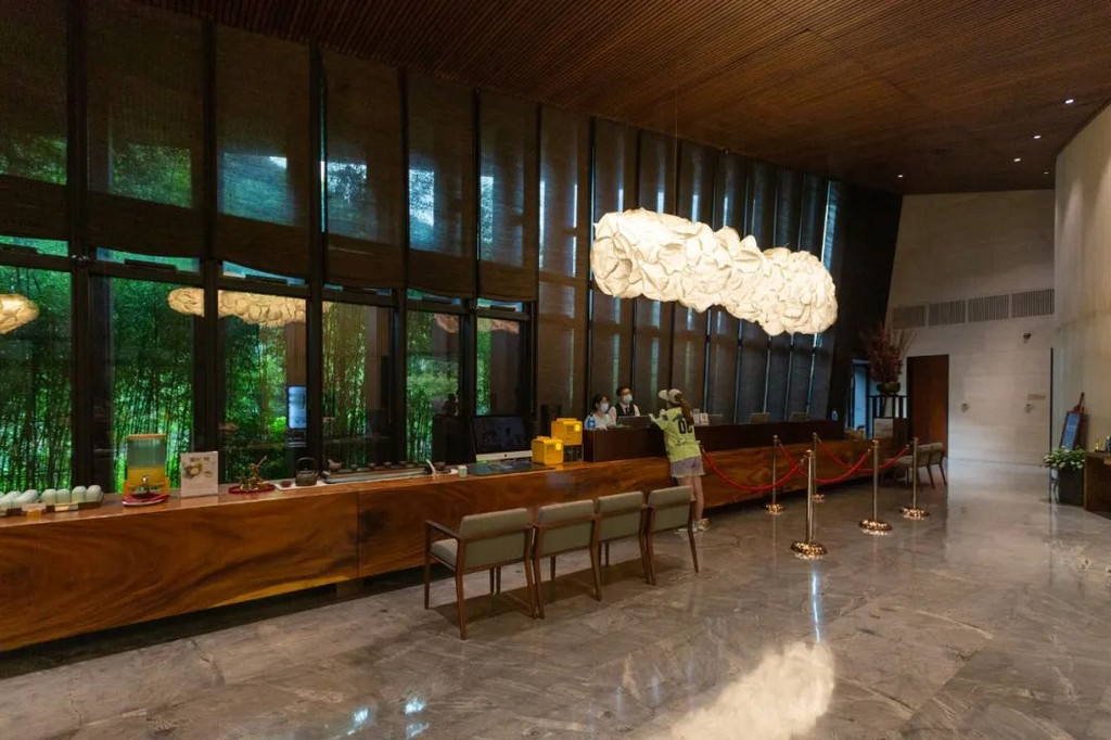驱车抵达酒店大门,扫码登记后,前往酒店接待大堂,办理入住登记,工作人员安排短驳车送至山里客房区域。