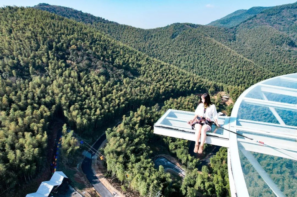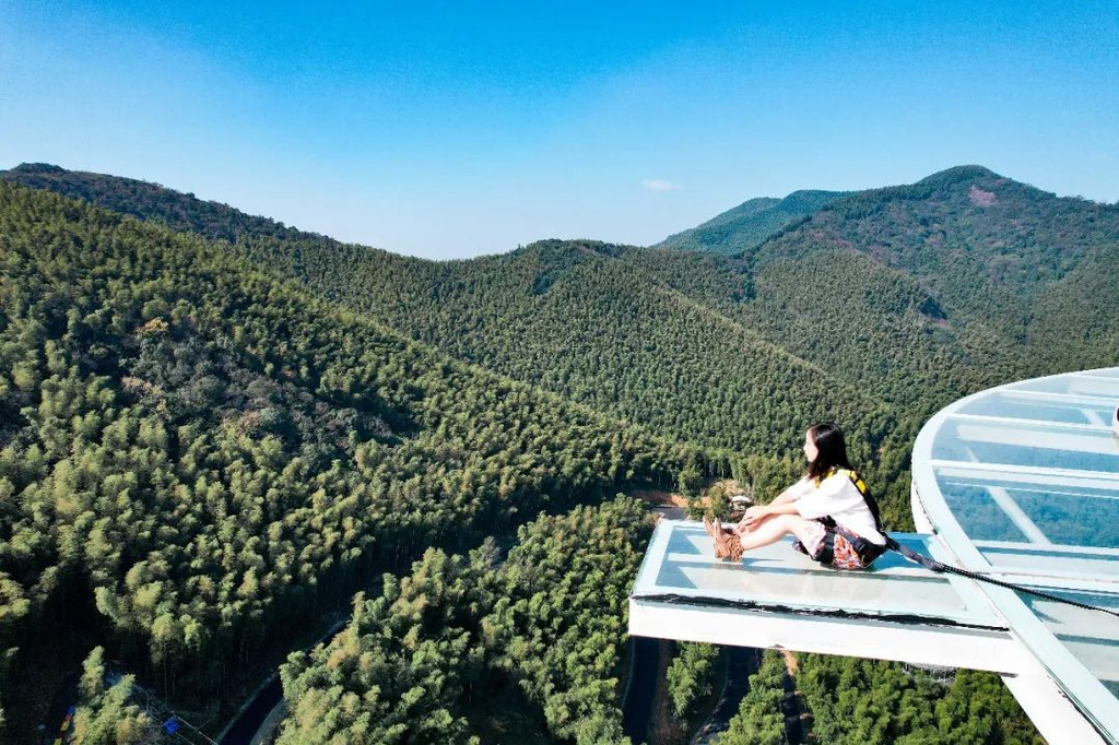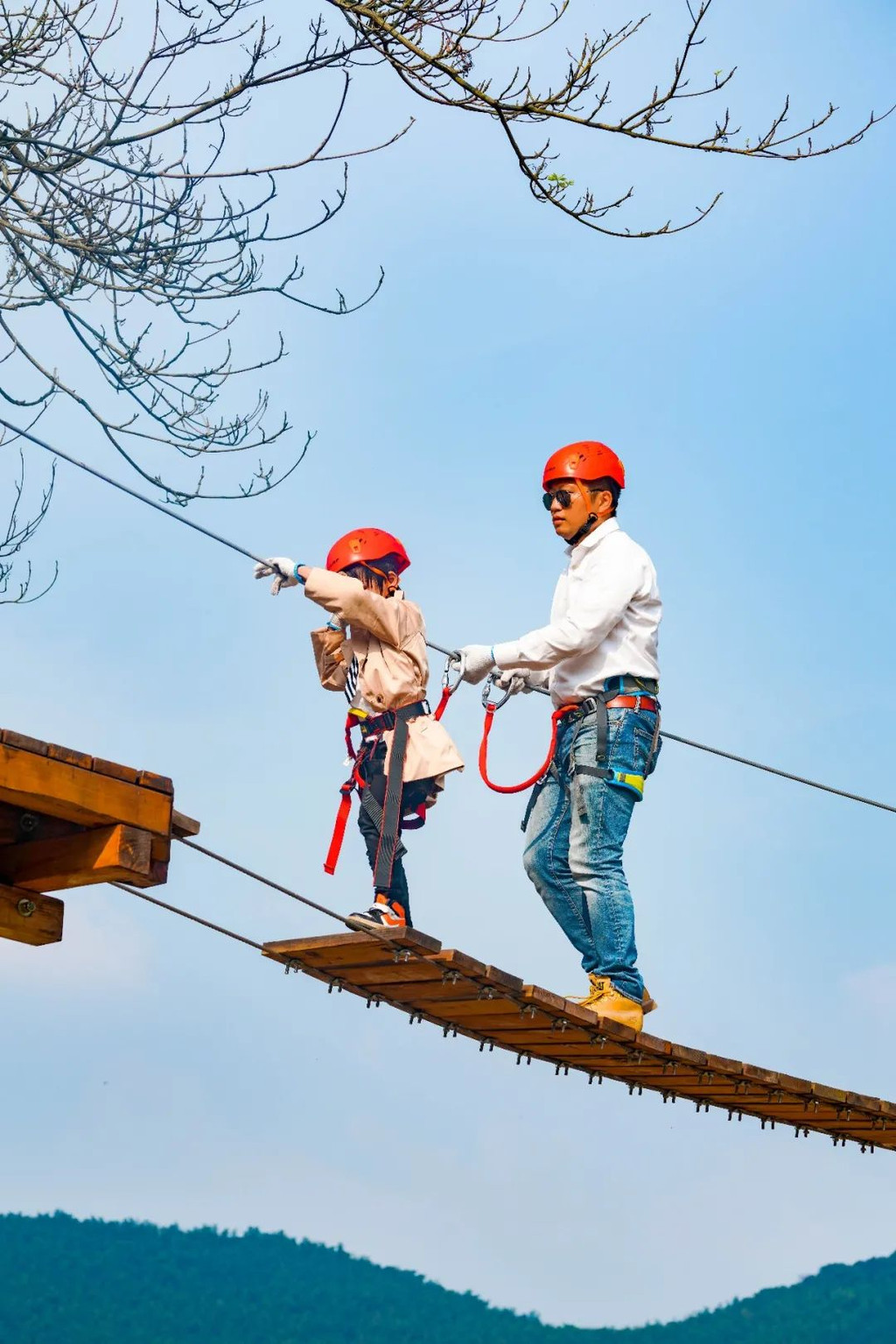 来到天际探险塔底,沿着旋转楼梯一路攀爬,宛如逐步迈向云端,站在天际探险塔的塔顶平台,不仅能俯瞰山峦竹海的景观,还能体验诸如空中漫步、高空秋千、弹射飞人、天际滑梯等刺激惊险的项目。