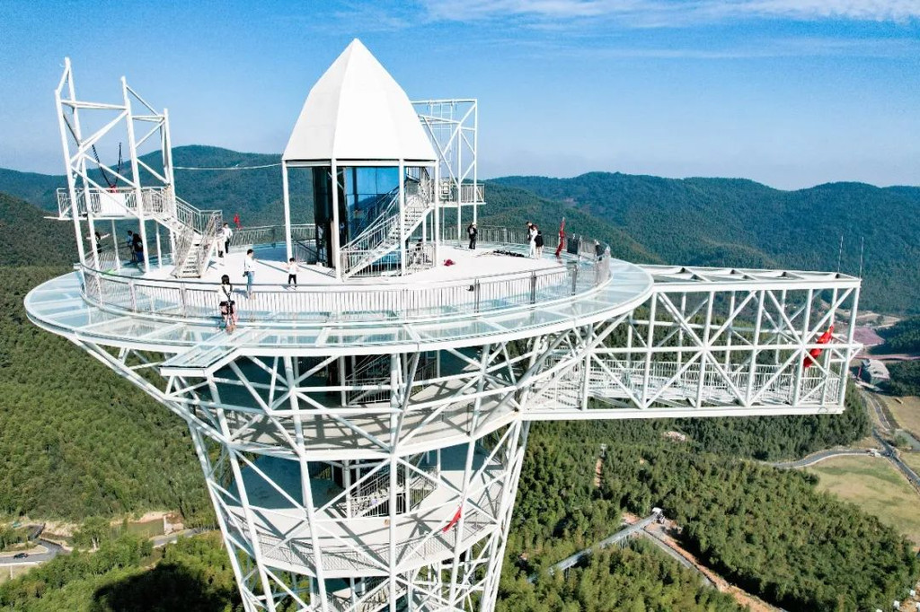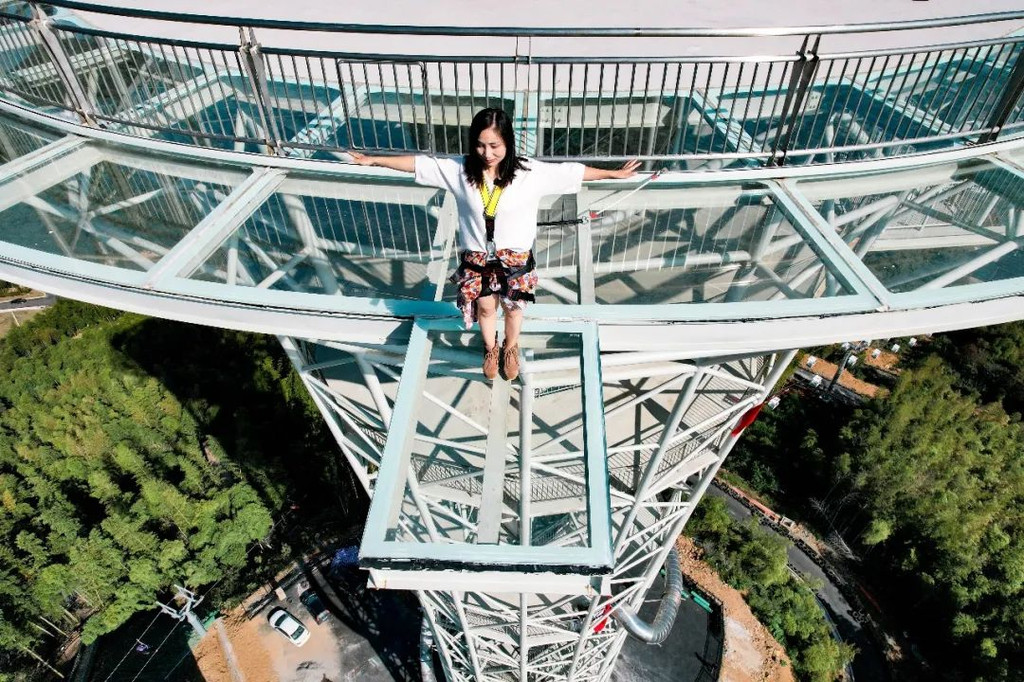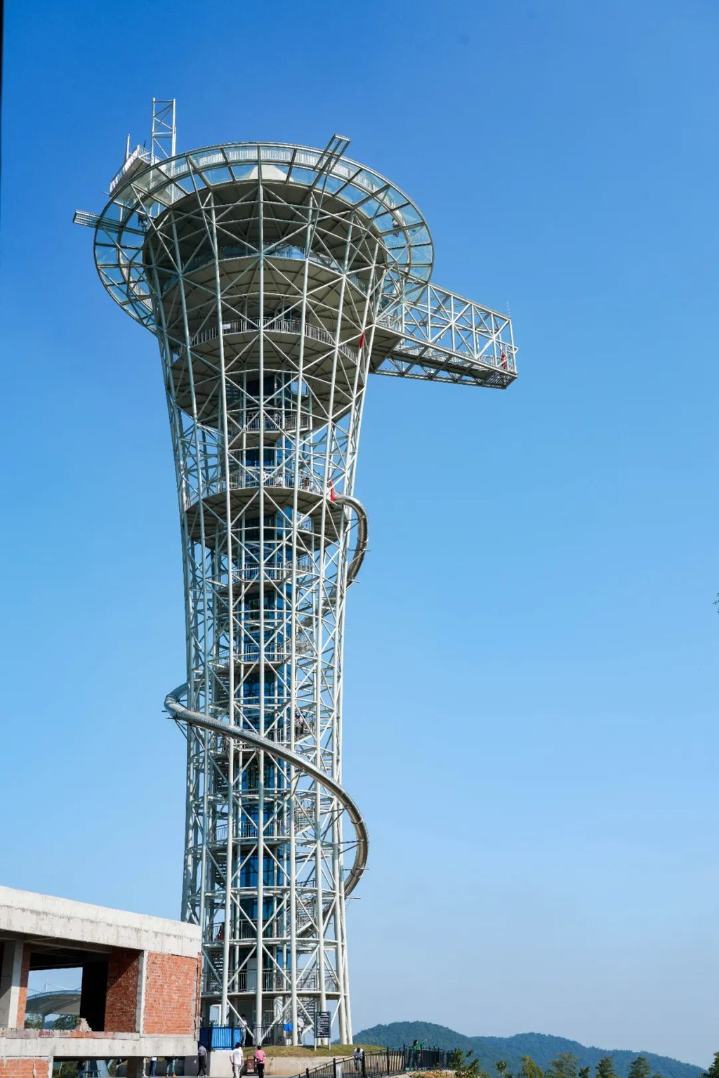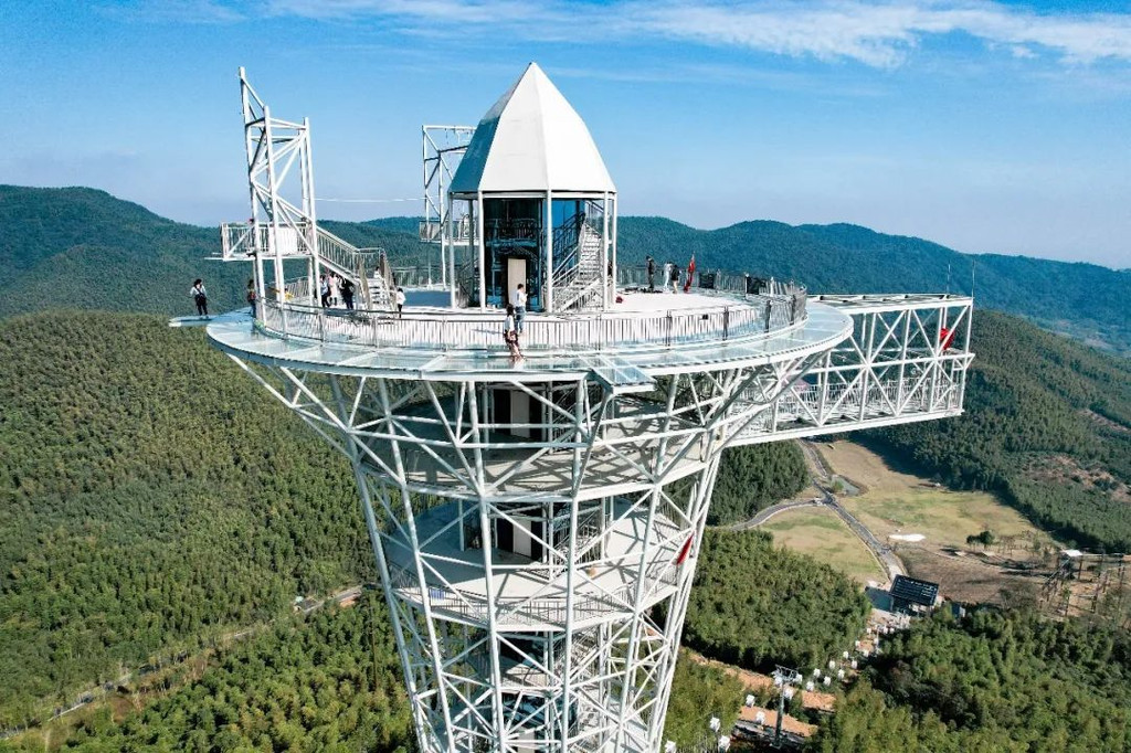 海拔296米的天际探险塔高耸入云,一进景区便能看到,堪称天际森谷的核心和地标。