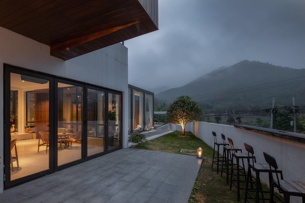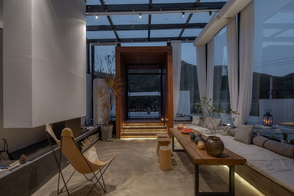 阳光房将大面积的落地玻璃窗和玻璃门运用到极致,设计师不希望门外的山野之色被厚重冰冷的墙体阻隔,而是希望眼睛所观之处皆是山野绿色,即使不走出室外也能将山林景色揽入怀中。