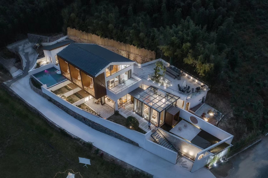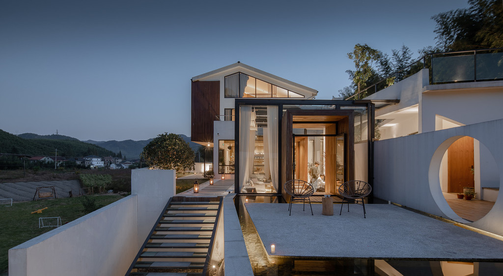 鱼缸花田美宿就像是一艘镶嵌于绿水青山间的巨轮,也像一条畅游于山林间的大鱼