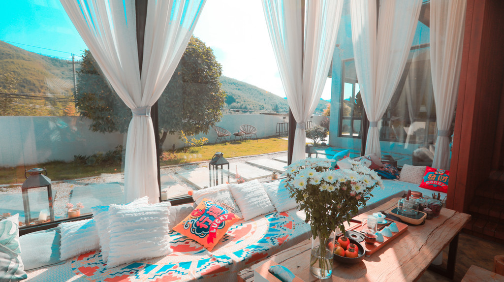 与民宿大堂相连接阳光房玻璃房,下沉式的包围空间让气氛更加浓厚,冬天里,围着壁炉,拥着暖阳,与友人互相喝茶聊天,体验悠闲自在的生活。