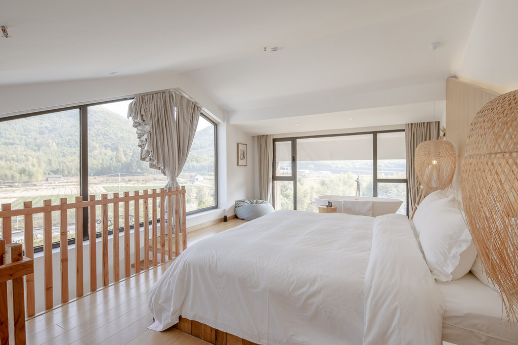 有综艺节目在这里取过景,林允在综艺《看我的生活》中住的民宿就是这一家的“鲸”。loft设计的房型简单明亮,落地大窗外是一览无余的山景。闲时可以坐露台吊床发呆,欣赏纯美的田园风光