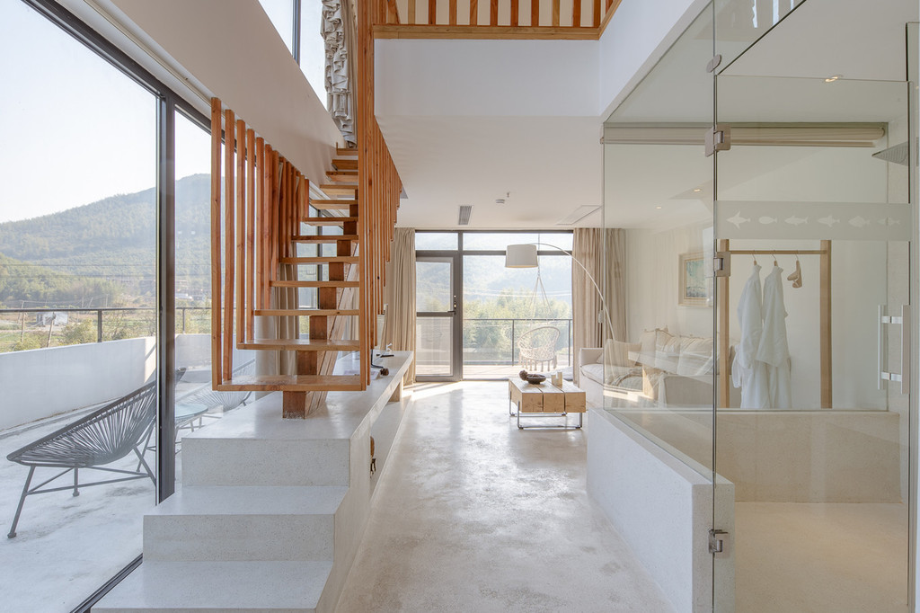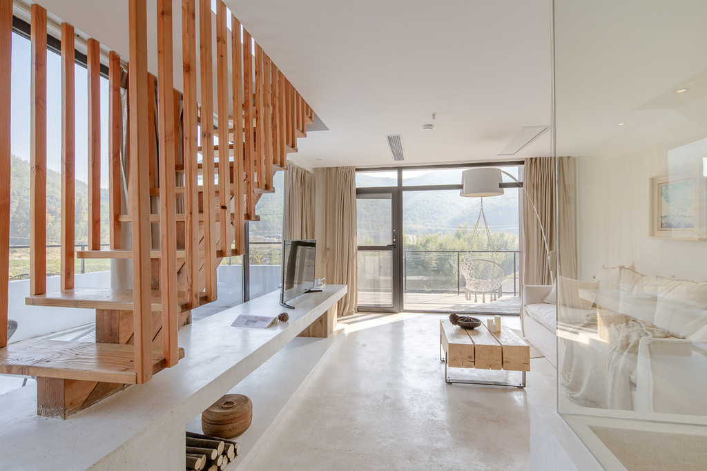 大面积的玻璃门窗让游客可以尽享自然风光房间内的大面积留白与原木家具,造型感极强的楼梯、床以及电视柜将空间装饰地恰到好处。纵横交错的楼梯以及开小窗口的楼梯充满了趣味性。