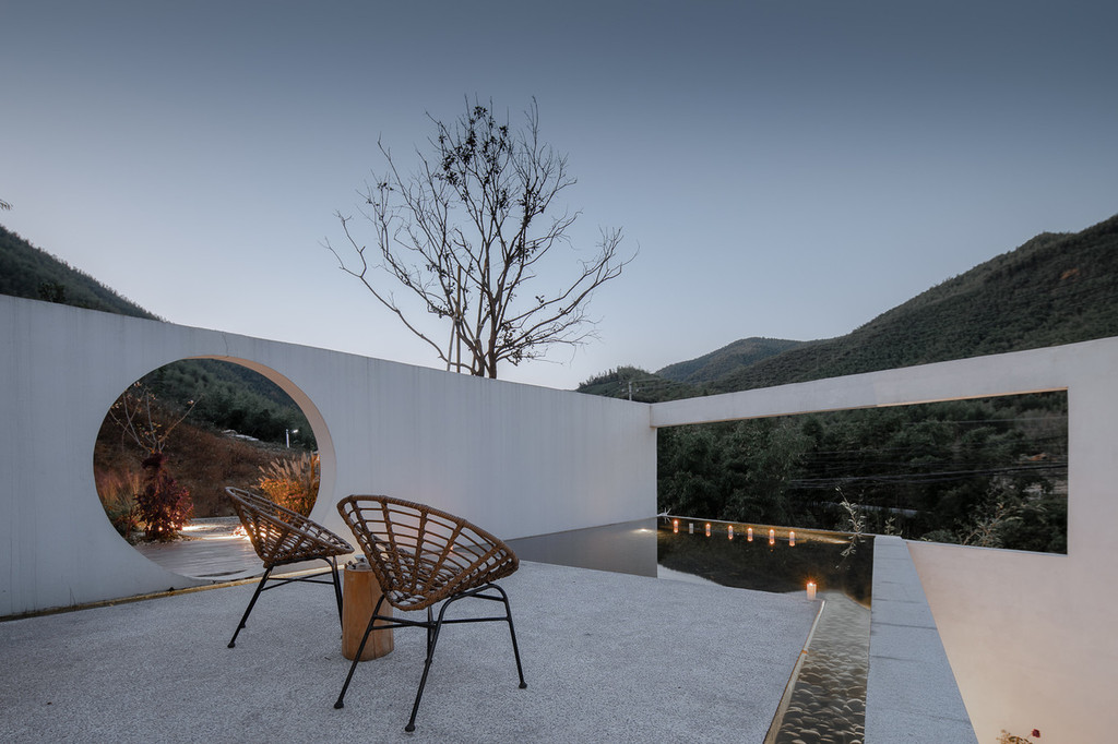 设计师在观景平台上运用了“天圆地方”的概念,坐在椅子上,透过方形的墙体望去,满眼都是一片碧绿的竹林,前方的水池将竹林景色倒映其中,融合成一副美丽的山水画,与自然仿佛进行了一场有趣的对话。