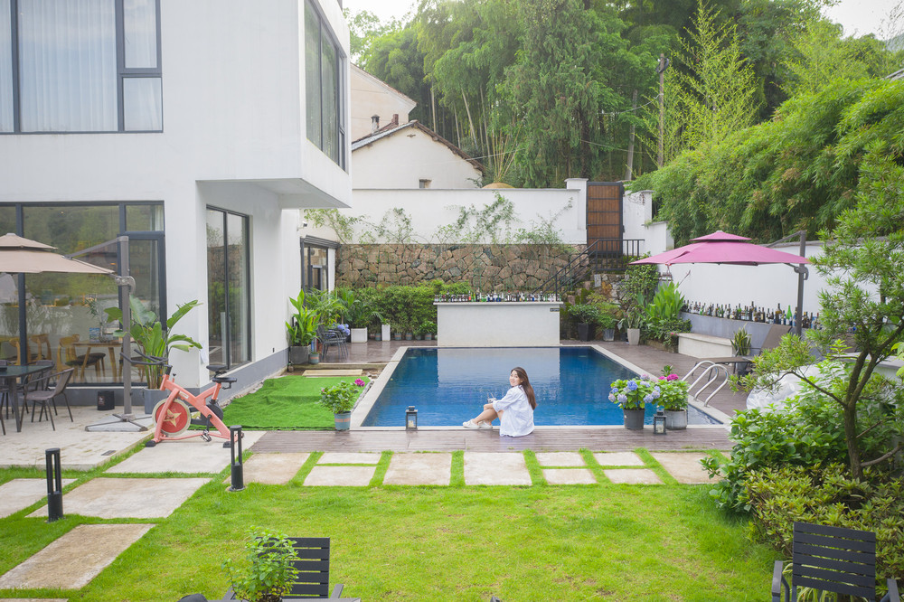 纯白色的独栋建筑,在一众房屋中显得尤为特别。整个花园搭配着蓝色泳池、露营天幕、岩石烧烤、蹦床足球等各种区域,组成了民宿最核心的户外公区。