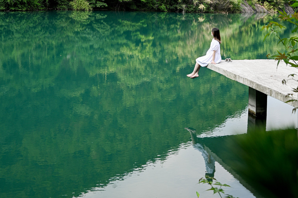 莫干山“小九寨沟”其实是莫干山内的大斗坞水库,水库的水呈现碧绿深蓝色,清澈无比,因此而得名。