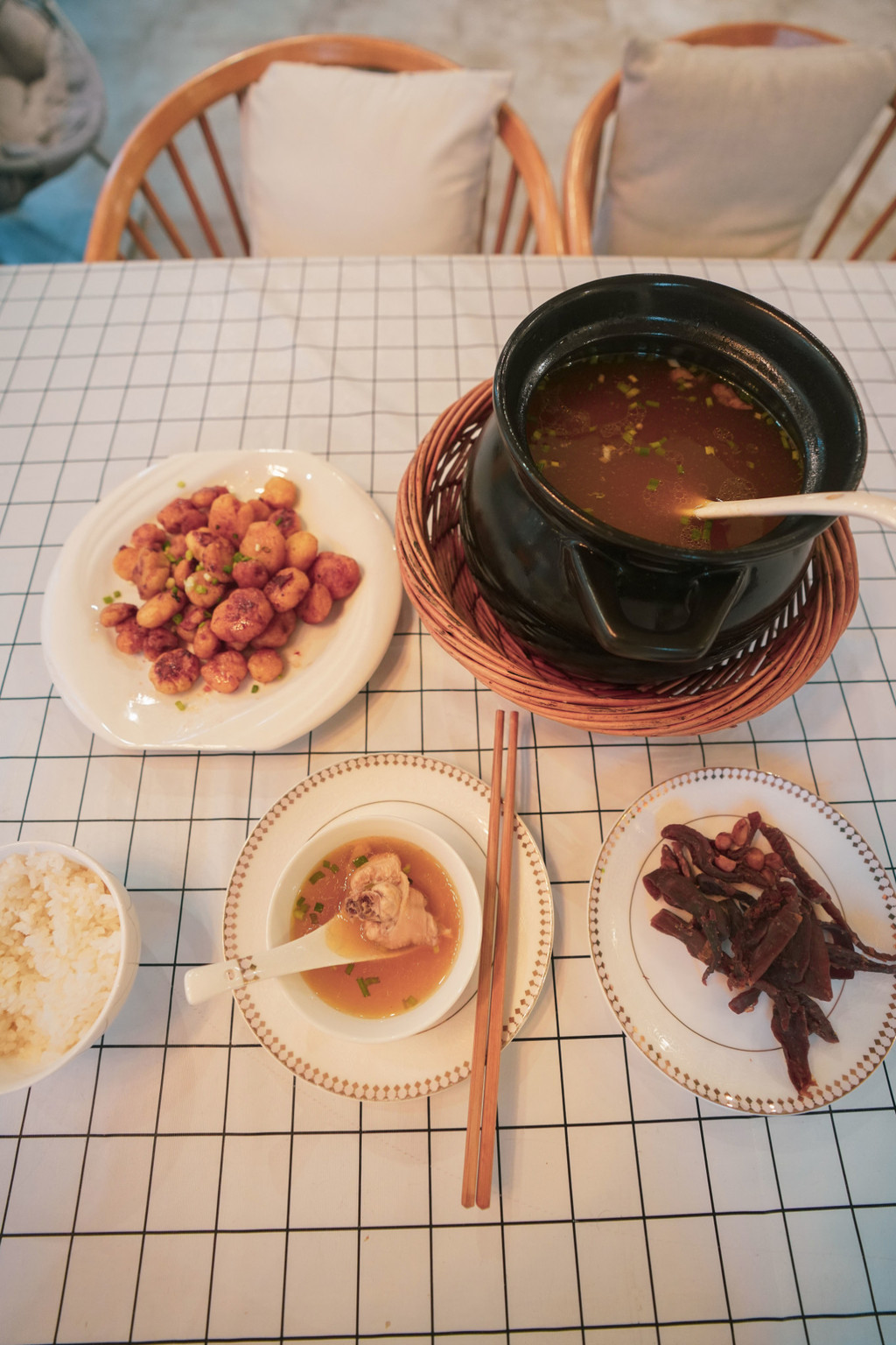 虽地处深山,却正应了那句“靠山吃山靠水吃水”,既然山清水秀,自是不缺山肴野蔌。有民宿主人自己养的土猪腊肉,及自己种的小土豆,自己家养的土鸡还有自己晾的笋干,以及山里现摘的野杨梅等等,这些家常菜也许每个人都会做,但做出来的味道都不一样。有时候一段旅程给你留下来的记忆是美食的味道,我对柴屿家的记忆也有很大一部分是这些入口入心的家常美味。