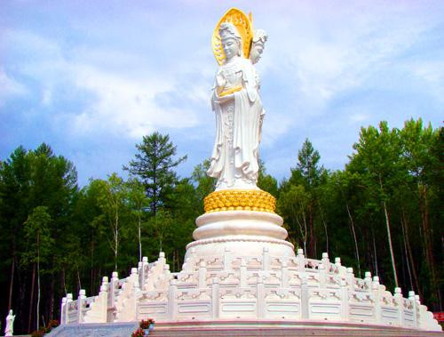观音山中的正观音为一体化三尊造型,每尊观音菩萨各持不同法器,代表了观音菩萨的不同化身,反映了观音菩萨普渡众生的方便之门。据说,漠河观音山林海观音奉安之后,观音山一年内三次出现“佛光普照”的神奇景象,佛光出现时,只见湛蓝的天上,淡淡的白云,一轮七彩皆备、艳丽夺目的光环如雨后彩虹,环绕着洁白如玉、恬静高雅的观音像四周,景象极为神奇美妙。