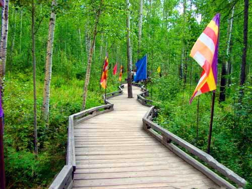 走进林中108个弯、468米长的木栈道,很有点在台湾嘉义游阿里山的感觉。这里山势舒缓,山形俊秀。山下是著名的胭脂沟,山间小溪缓缓流向山下,预示着北水直通南山。这里的北极林海观音10.8米原身座北朝南,与海南南山海上观音108米法身像坐南朝北,南北相望,遥相响应,成为众多游人来此膜拜瞻仰必到之处。