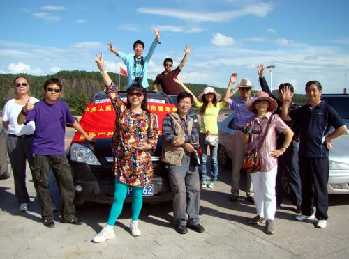 8月7日一早,车队从漠河启程,顺正在修建中的漠北公路向北极村进发。其实从漠河到北极村实际距离只有80多公里,但由于目前这段公路正在扩建之中,所以极为难走。一般视路况情况都得两三个小时的行程。途中,车队顺路首先经过观音山,于是车友们上山观光。