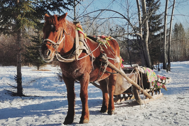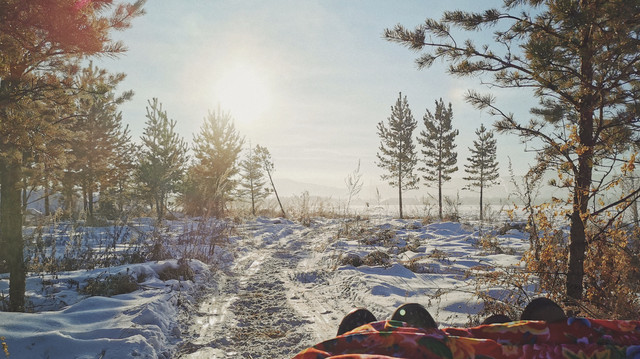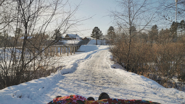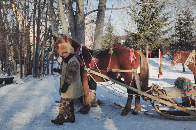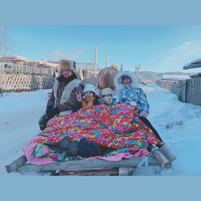 泼水成冰结束后,返回民宿收拾行李,然后体验原始交通工具——马拉爬犁,环村一圈,价格是100/人,躺在木车上,大红被子一盖,突然就有内味儿了哈哈哈~有意思~