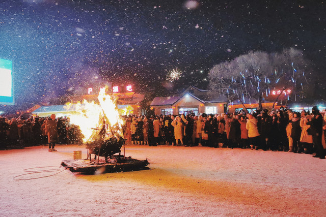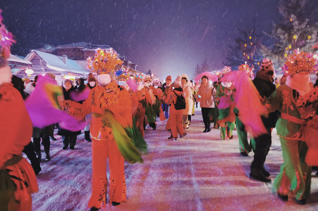 晚上7点整是东北扭秧歌游行表演,可以混进队伍里跟他们一块跳哈哈哈,所以不要害羞,尽情去玩就好了~最后游行结束之后,队伍会把你带到篝火晚会的地方,跟着他们走就行,假如你想参与篝火晚会的话。