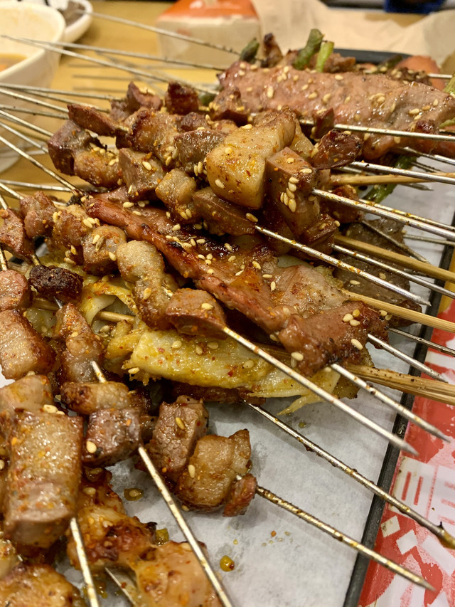 吃饱饱后就在附近逛了逛,到晚上8点多,去老味烧烤打卡,也是口碑第一哦,确实很好吃,价格也很公道,四个人,200多,还是吃不完。。有点罪恶emmm