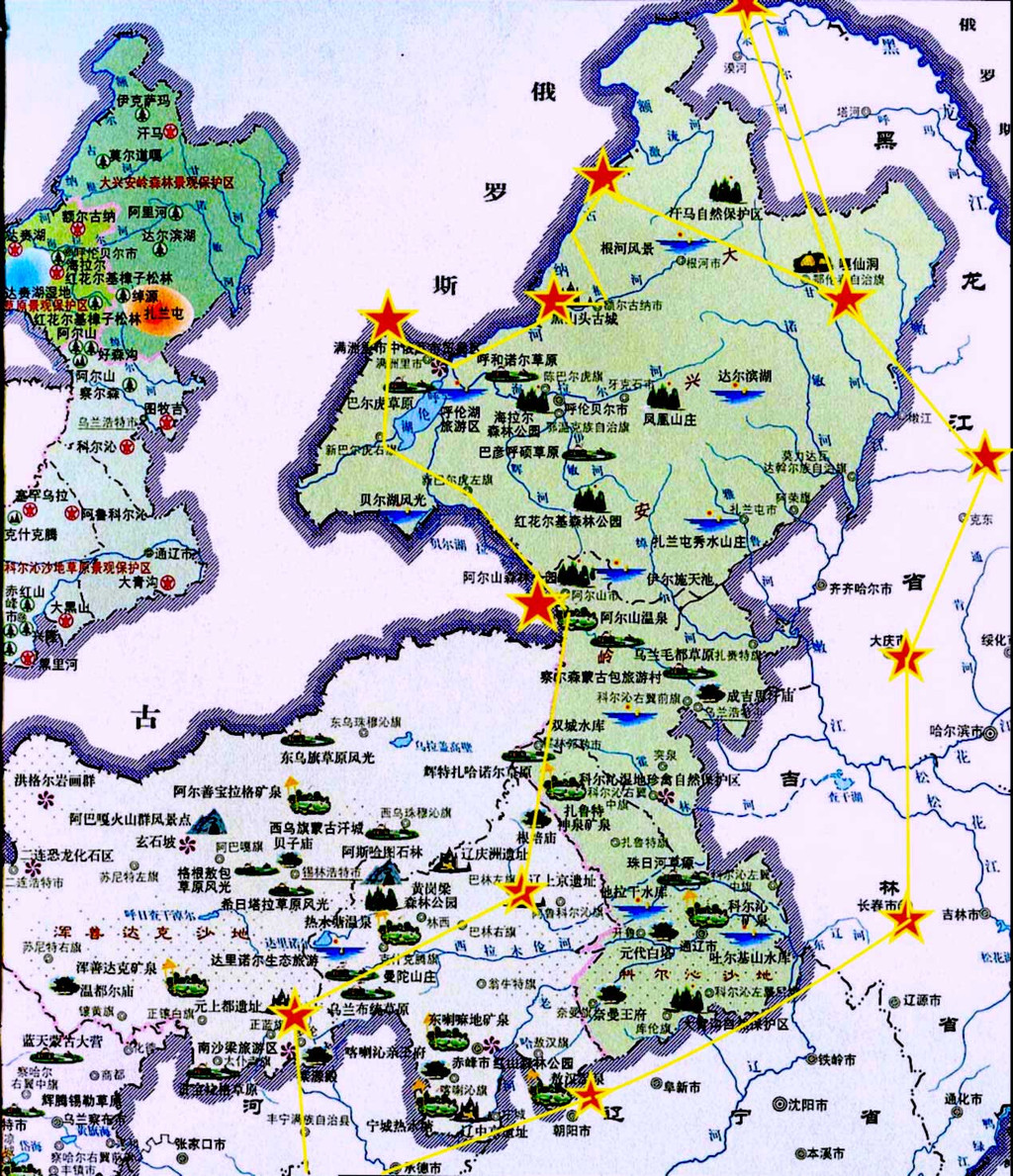6月15日从北京出发,目的地是中国最北的北极村,路线设计要看初夏鲜花盛开的草原、枝叶繁茂的森林、夏至前后达到最北体验“白昼”、兼顾东北地区的历史古迹。7月5日返回北京,历时21天,行程6500公里,每日行车安排的比较轻松,最多的一天也只走了600—700公里,一般换场就是200—400公里,沿途可以多玩多看。自驾日程如下:D1-北京出发经丰宁到正蓝旗,进入锡林郭勒草原;D2-参观元上都博物馆,去巴林左旗;D3-游览辽上京遗迹,参观博物馆;D4-车观锡林郭勒大草原,入住阿尔山市;D5-游览白狼景区,参观日占时期的历史建筑;D6-游览天池、杜鹃湖景区;D7-车观呼伦贝尔大草原,到达满洲里市,沿途看诺门坎遗址、呼伦湖;D8-游览国门景区、套娃广场、套娃酒店、步行街、沙俄监狱、博物馆,品尝俄餐;D9-走风景第一流的“卡线”,住停黑山头镇,傍晚欣赏额尔古纳河落日;D10-黑山头以北过水路面的积水过深,绕行额尔古纳市再返回七卡,之后八卡、九卡到室韦;D11-原计划走满归去漠河,因桥梁水毁绕行加格达奇,入住加格达奇市;D12-到达漠河,参观大兴安岭火灾纪念馆,晚上给同行的朋友过生日;D13-先去北红村,之后入住北极村;D14-游览黑龙江洪水刚刚退去的北极广场,乘电瓶车北线、南线观光;D15-计划中的黑河由于洪水不能去了,返回加格达奇;D16-去五大连池,游览老黑山火山公园、水晶宫火山隧道、火山博物馆;D17-入住大庆,游览市容、参观大庆博物馆、铁人博物馆;D18-抵达长春,游览满洲国皇宫;D19-参观东北民族民俗博物馆、吉林省博物馆、长春电影制片厂;D20-入住朝阳,游览辽代古迹;D21-返回北京。