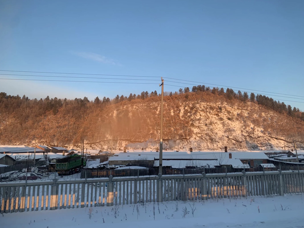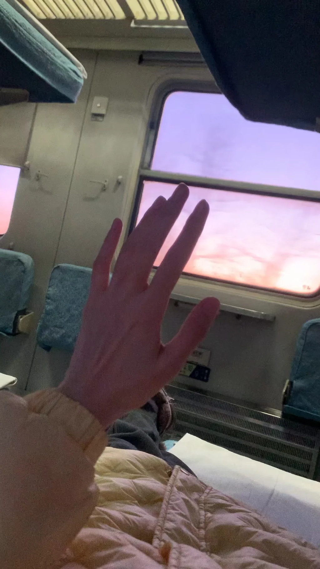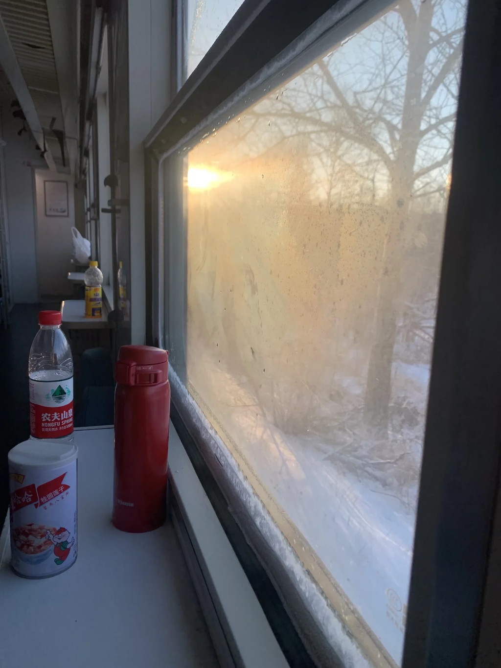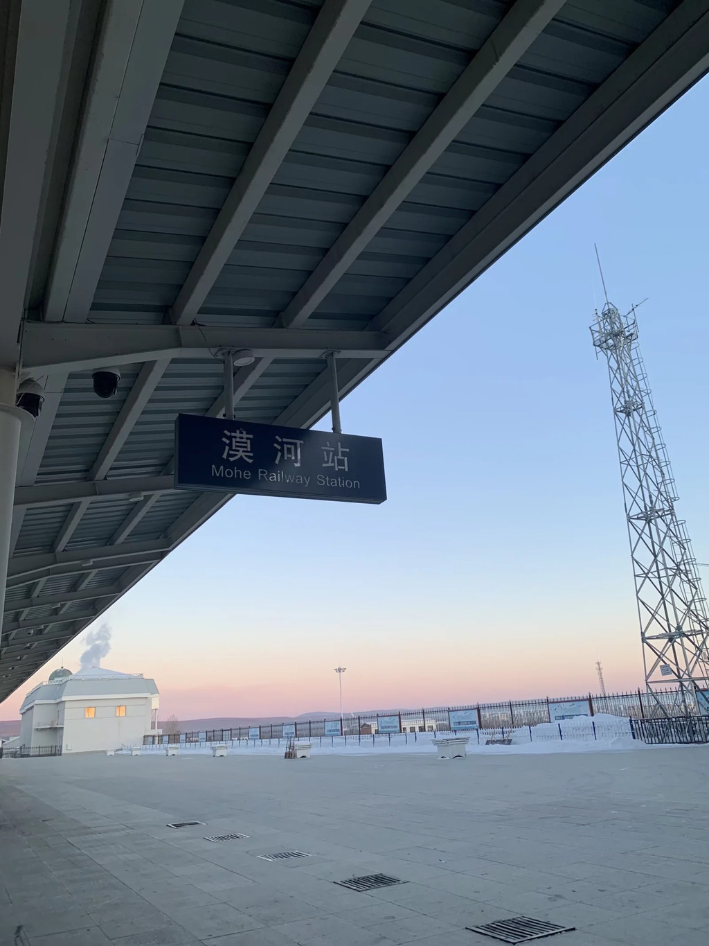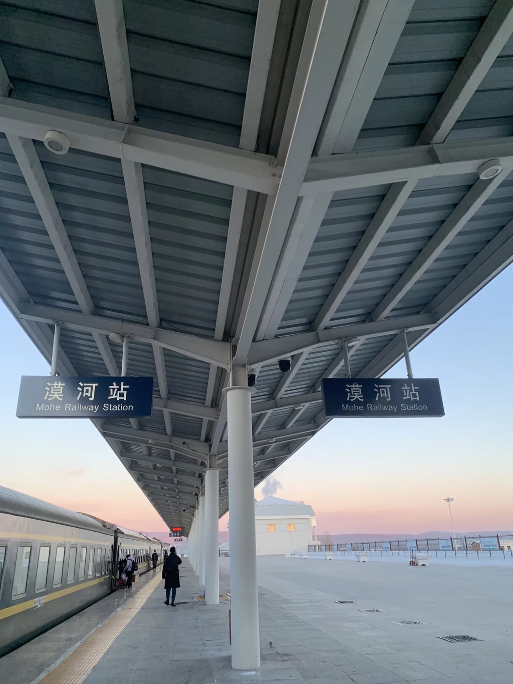 2022.01.10今天是回程的日子,还是照常七点多起来吃早餐,今天要坐核酸检测,大家去村里卫生院排队做好后,直接开车一个小时去了去漠河的市区,路过白桦林还是忍不住停下来拍照,实在是太美了,逗留了会,到了市区后,小哥给我们每个人买了一串糖葫芦,真别说,东北这户外的做的就是比我们南方的口感好,不知道为啥, 吃完就直接蹦跶去了图上的铁锅炖大鹅,,下面再烧火取暖,上边在大口大口吃肉,东北人也很会享受啊,哈哈,饱餐后和小哥告别,他的老父亲接送我们去市区转悠,博物馆啊还有一个公园,还是太冷,大家都没什么状态,就去超市买了点小吃特产,就早早的去了火车站了,叔叔人还非常好,一路下车给我们开门关门,还给我们拿行李,特别亲切,火车站非产小,跟我们大福安的东车站差不多,下午三点的火车,又是十七个小时的车程,和大家一一告别后就找车厢落座了,刚好是快到四点夕阳西下的时候,然后火车启动的时候,坐在车厢里的我看着外面的风景,粉红色的夕阳像是日漫动漫里的景象,和嘟嘟天南地北听着她的阅历,聊了会,吃了泡面,洗把脸就去睡觉了,告辞了。啊哈,再见啦漠河,有缘再会。上图