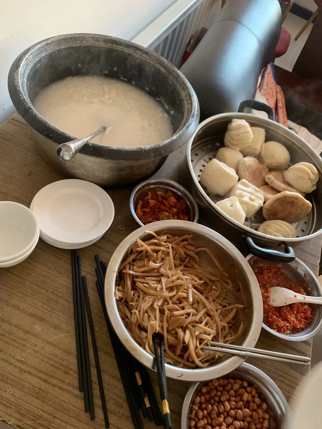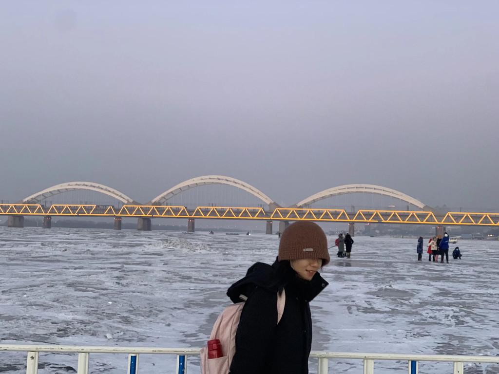 2022.01.04今天也是睡了自然醒,于前一晚又点了一份夜宵,我实在太爱东北的夜宵啦,真是好和口味,吹了一晚上空调脸肿肿的,忘记给这家酒店差评了哎呀,空调不行,热水也不行,整的我两天可闹腾,等另外一个一起出行的驴友,一起吃了东北大饺子,真香哟。小哥霸气请客,这回是男同胞,也是自己游历大江南北,我算是跟着他步伐前进了,因为他来哈尔四五次了都是自己来,真是敬他是条汉子啊,独自一人这么冷的天雷打不动每年来体验。果真是人各有志,然后再一起逛了下闻名已久的松花江大桥,走在结冰的江面上面真是恍恍惚惚羡慕不已,让我想起那句广告语,德芙纵享丝滑哈哈哈。要是会溜冰和滑雪我的东北行应该可以说完美了,因为光想象就觉得很爽哇。回去休息了会,一起回住宿各自休整了下吃了午饭,坐着下午得动车去吉林延吉,(本来计划是去中国最东抚远的,疫情太严苛,很多地方不能去了,那就等有机会的时候再去一趟吧),长达五个小时的动车,到达延吉,一个让你错以为你在韩国得中国朝鲜族部落,好吃的年糕寿司豆腐汤部队火锅拌饭等等等,都是我爱的,下动车后直接入住酒店,这里连着住了三晚,入住体验感很棒,然后整装,海口小哥要带我吃第一餐海底捞,真是很错愕哈哈哈,他真的是有多爱海底捞火锅才能放着那么多的美食于无物。再用人家得黑金会员享受一番后,就回住宿休息了,映入眼帘的都是韩语中字,老有身临朝鲜得错觉,晚安,DAY3