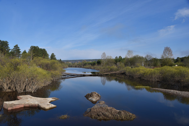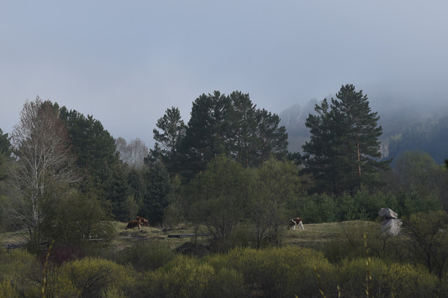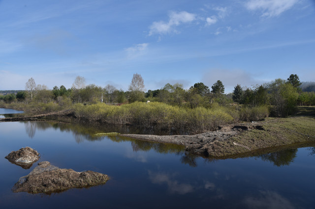 返回途中天空放晴,站在桥上左顾右盼,夏天的北国风光依然美丽。废弃的吊桥,残破的游船,平添了几分萧瑟;葱翠的草木,悠闲的老牛,增加了几多生机。有道是:冰融雪化,绿地碧水芳草地;烟消雾散,蓝天白云艳阳天。