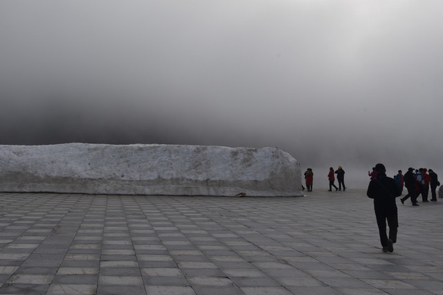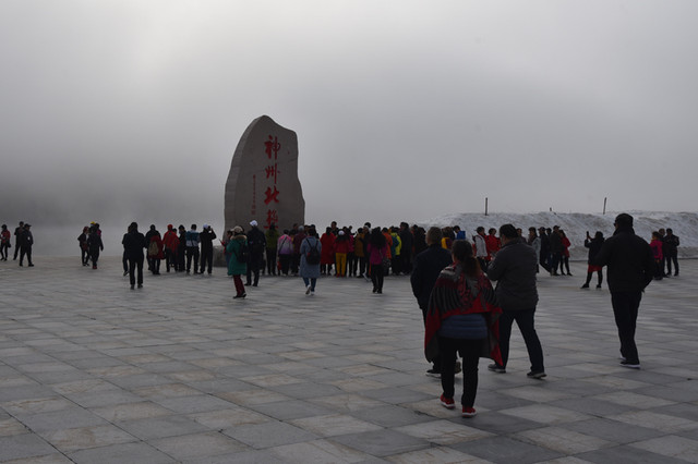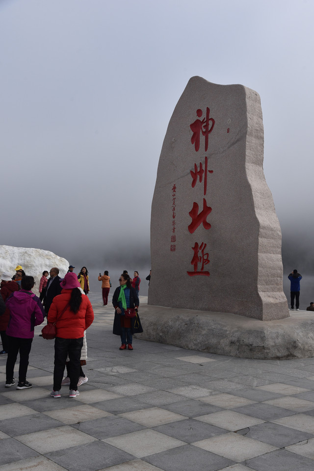 站在广场上,环顾四周,一座巨大的雪雕作品已经面目全非,一块天然花岗岩上刻有“神州北极”四个大字。这个石碑与三亚天涯海角景区的“南天一柱”奇石南北呼应,是北极村的一个象征性标记,成为中华北极的标志性建筑物。