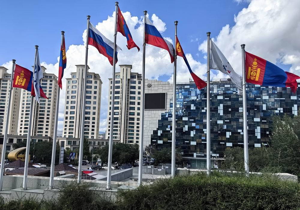 抗日纪念碑上面飘扬的蒙古和俄罗斯旗子。