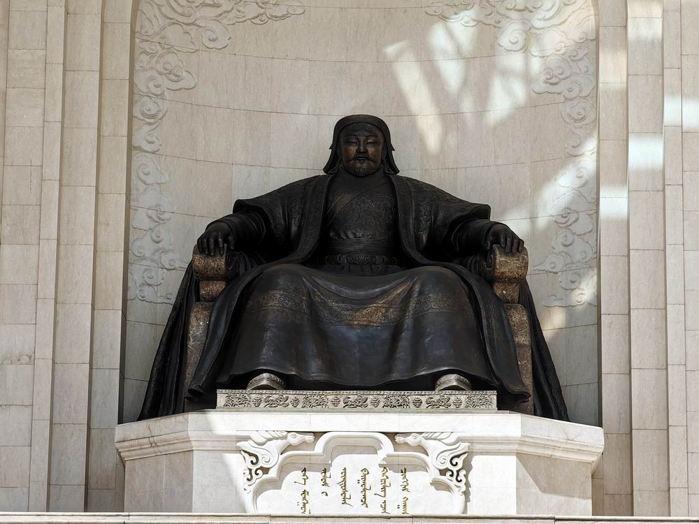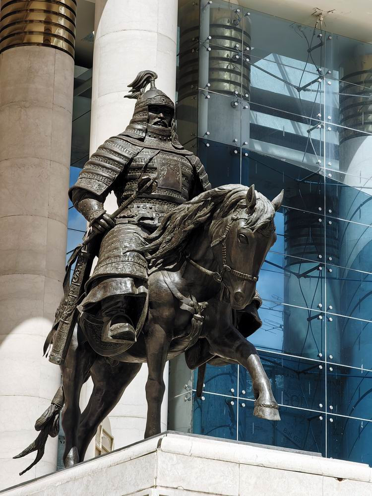 苏赫巴托广场又叫成吉思汗广场。为纪念2006年成吉思汗登基800周年,新建了蓝色穹顶和玻璃幕墙,安放三尊铜像,正中心是成吉思汗。