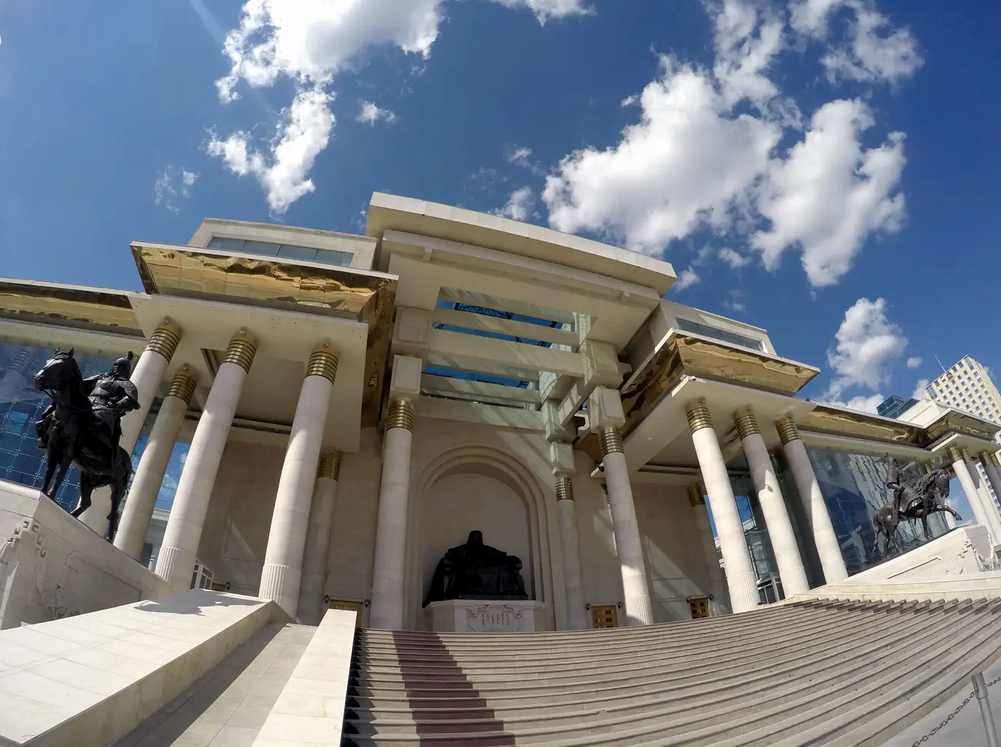 广场的正面(北面)是国家宫,原称政府大厦,建于五十年代初,共4层,是总统、议长、总理的办公地,设有会见外国领导人的国家礼仪宫、会谈大厅等。照片摄于苏赫巴托广场。