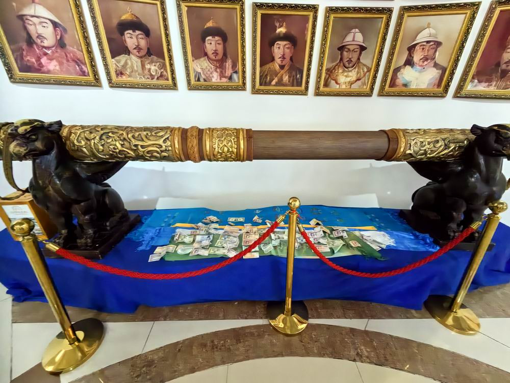 一面墙上展示着该成吉思汗骑马雕像的吉尼斯世界纪录证书,上面记录着:世界上最高的骑马雕像“成吉思汗雕像群”记录在2016年吉尼斯世界纪录,雕像高40米,由 Genco Tour Bureau JCS建造,2006年完工,位于蒙古国图瓦省。图为航拍的成吉思汗骑马雕塑。