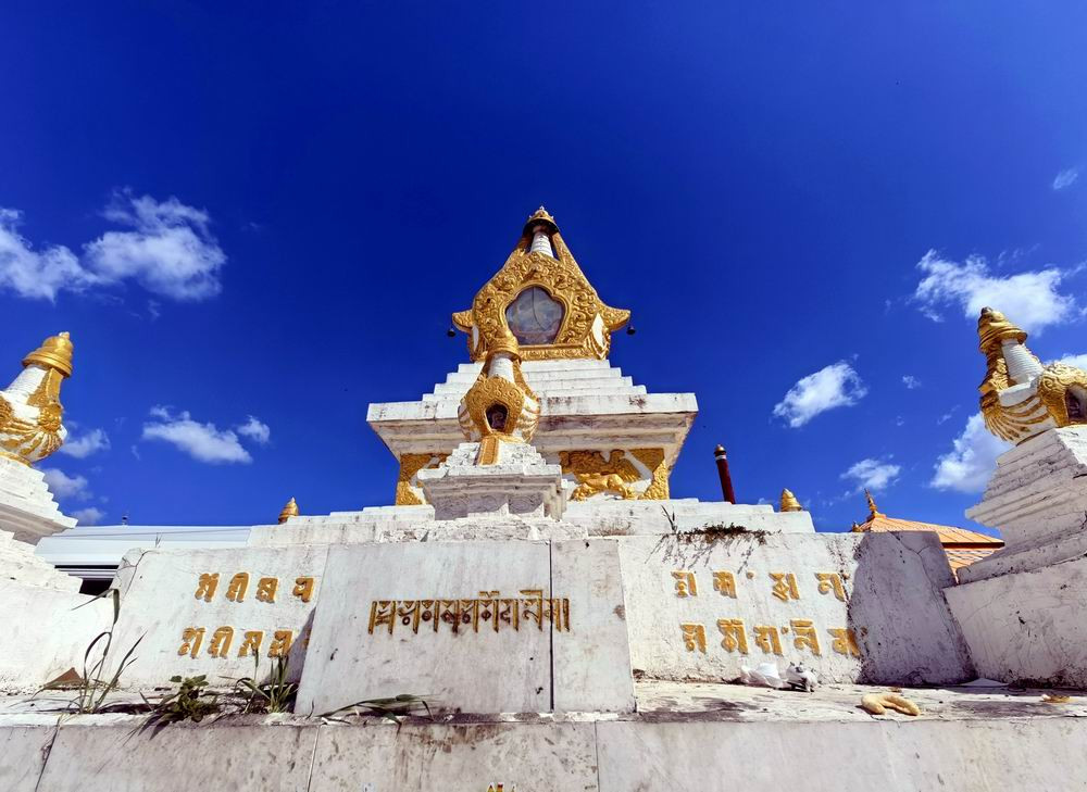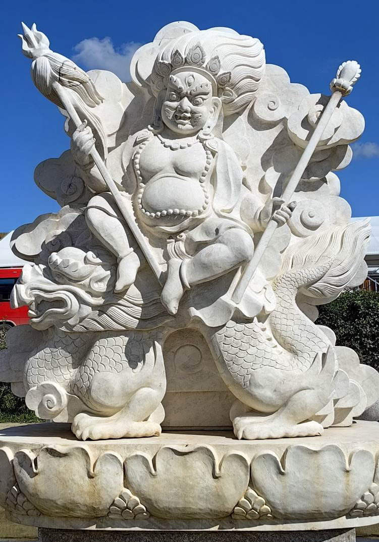 在释迦牟尼浴佛像后百米左右有一尊白财神,白财神又名“白宝藏王”,藏语称“赞布禄嘎尔布”,是观音菩萨的慈悲化身,头戴骷髅宝冠,头顶的火焰象征愤怒,三只眼,张着大嘴,左手持三股戟,右手拿一根短棒,以游戏姿坐于碧龙背上,龙为座骑表示解除自我和他人的一切贫穷之苦。