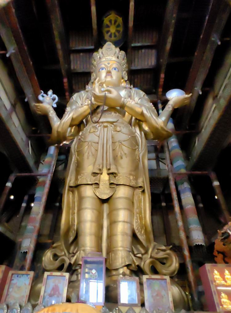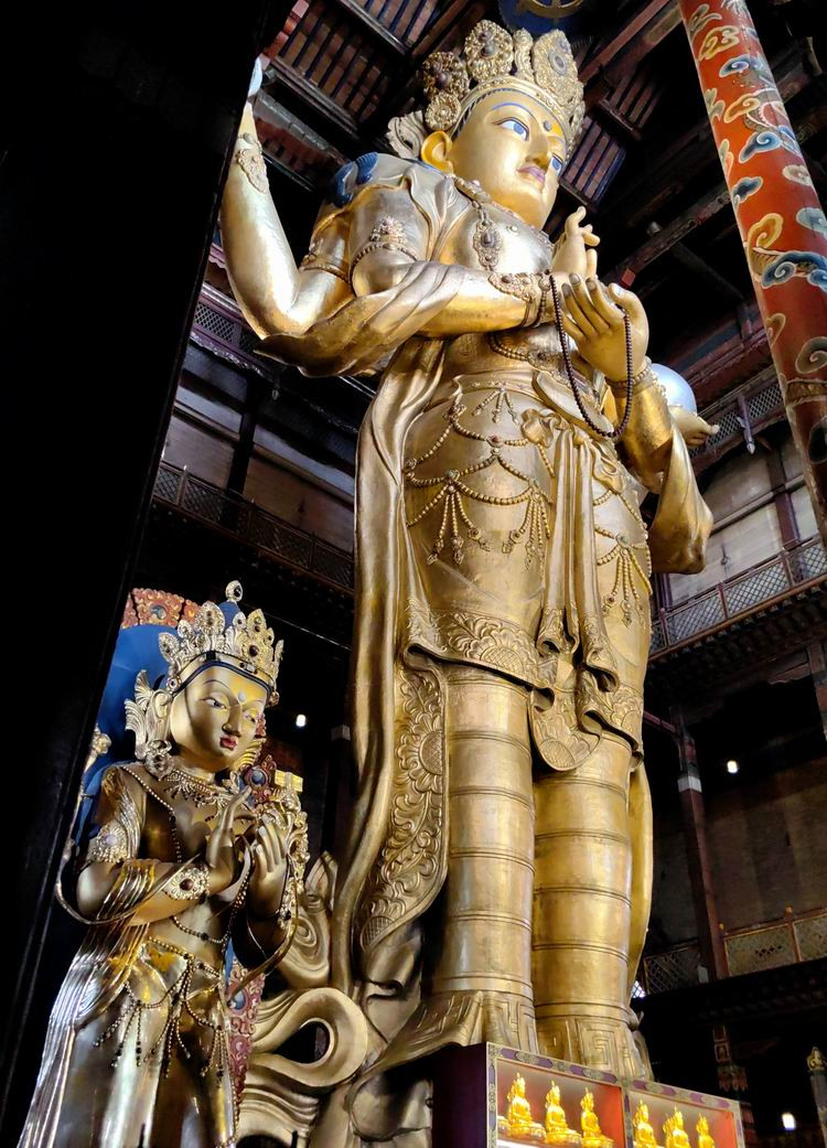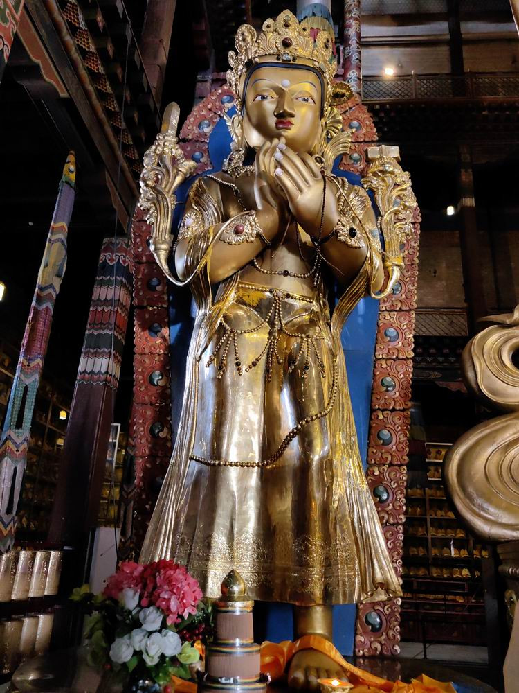 观音殿内最引人注目的便是高达26.5米的章冉泽大佛,章冉泽大佛翻译过来就是观音菩萨,是全世界最大的铸铜观音菩萨塑像,佛像过于高大,以至于只能仰望才能看清观音菩萨的全貌。照片摄于甘丹寺。