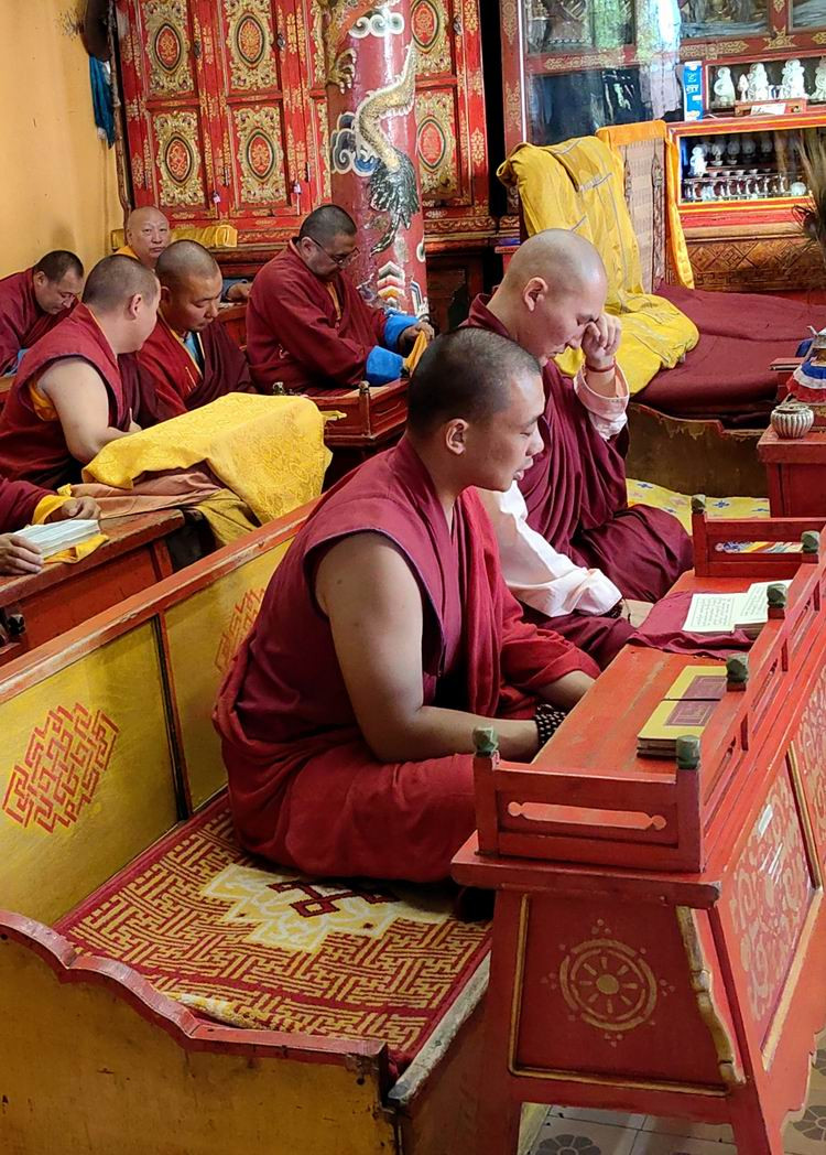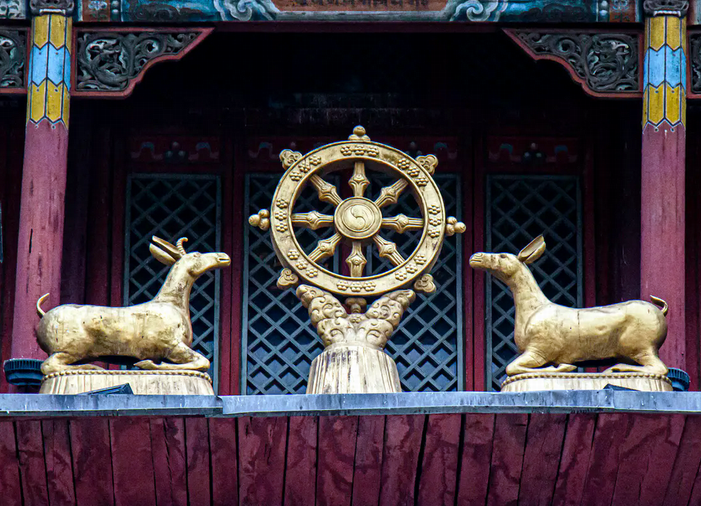 在甘丹寺主路的尽头便是观音殿。观音殿的外立面上装饰着法轮,法轮是佛教的八宝之一,代表佛陀的手掌。照片摄于甘丹寺。