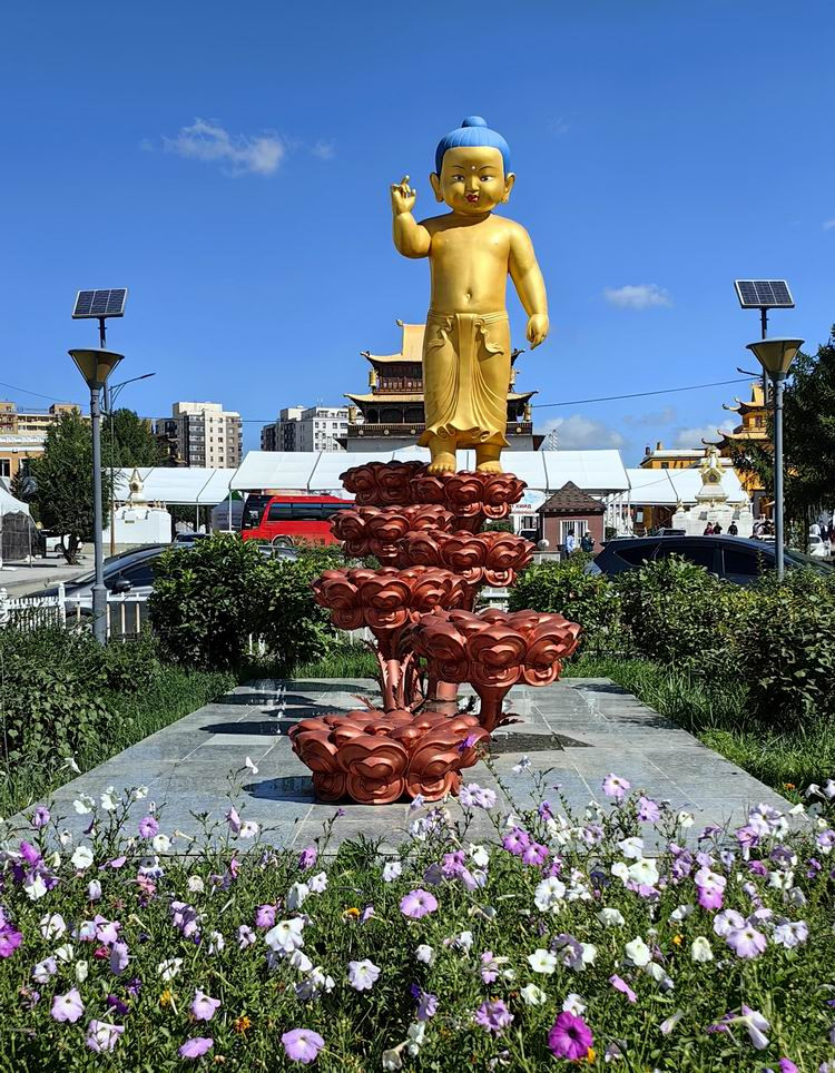 寺内最引人瞩目的是世界最大的铜铸大佛,高达 28 米,全身镀金,镶嵌大量宝石,气势雄伟,富丽堂皇,是蒙古的国宝。照片摄于甘丹寺。