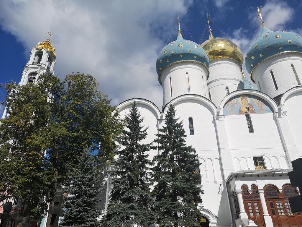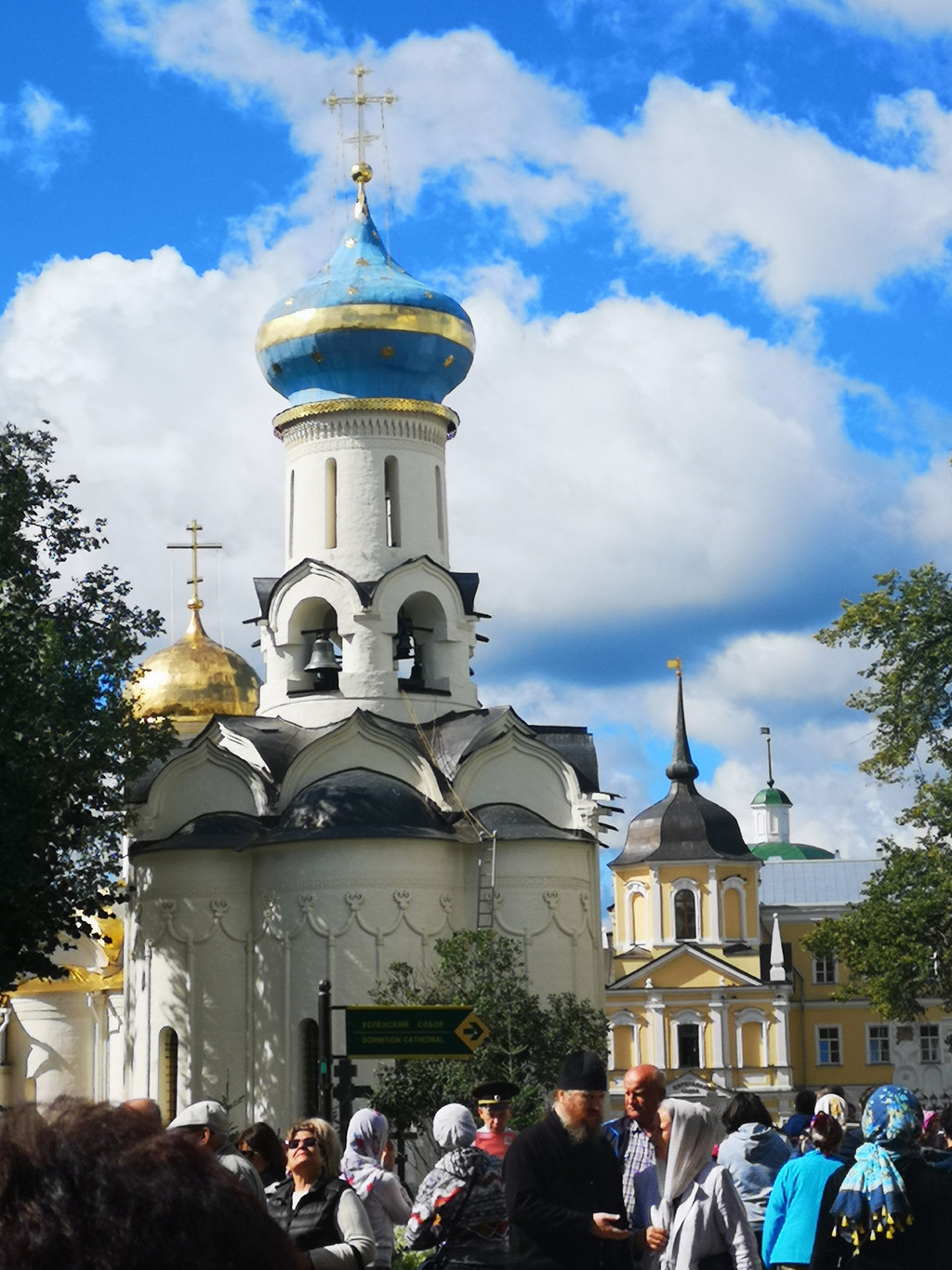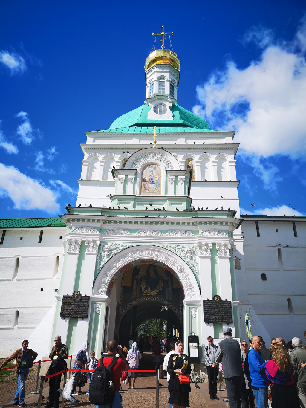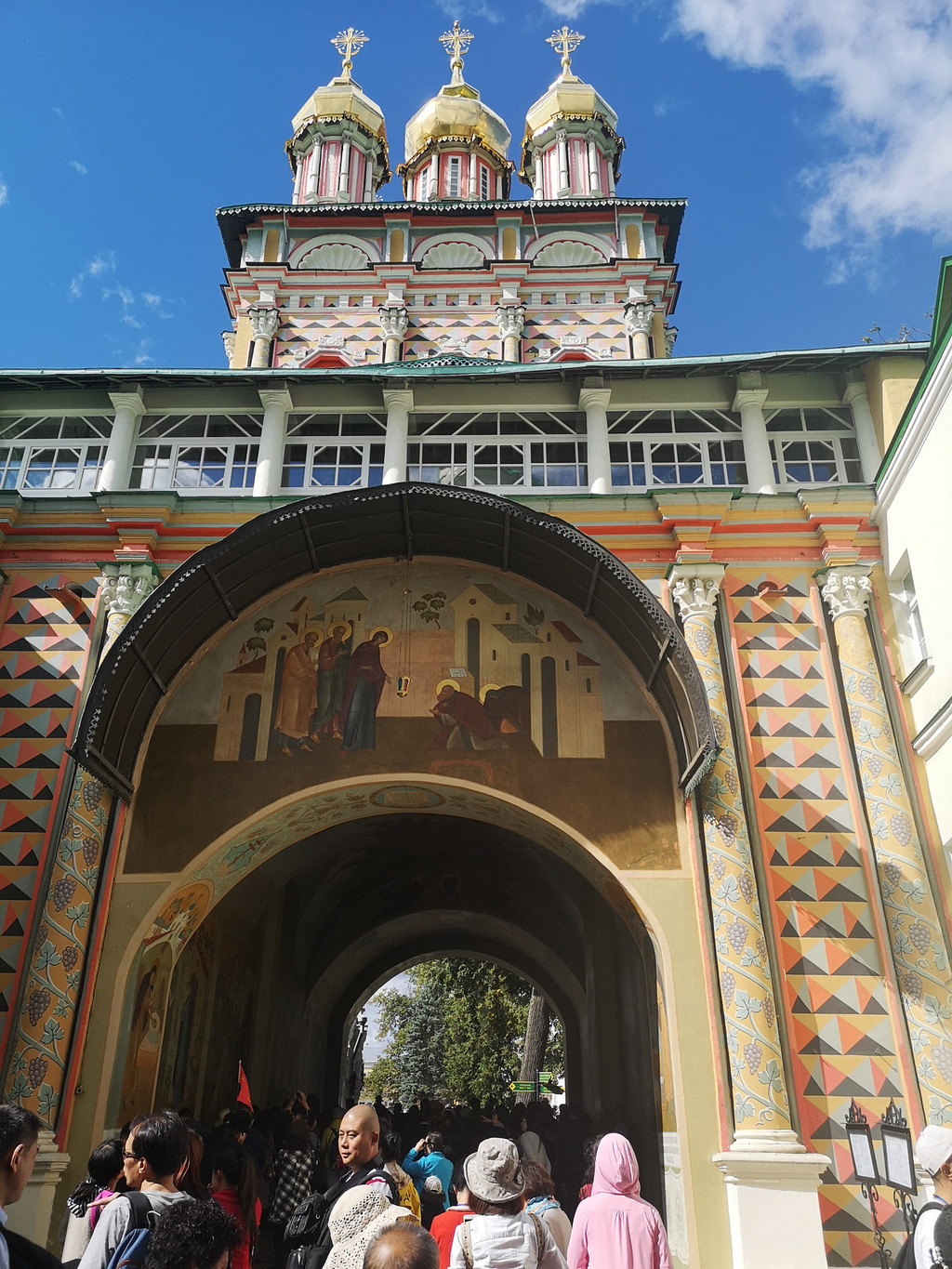 今天是正式俄罗斯旅行的第一天,今天 的行程是早餐后前往位于莫斯科东北70公里处的谢尔盖耶夫镇,造访★圣三一修道院,这是俄罗斯东正教最古老的修道院之一,是俄罗斯东正教会的精神中心。汽车到达修道院,只见门前广场上停满了旅游大巴,游客如织。数不清的鸽子自由飞翔,人们投食、拍照,好不热闹。我们跟随人流进入到修道院内,真是被眼前景象惊到。一座座风格迥异的教堂,环绕在广场四周,每一座教堂屋顶都不相同,洋葱头屋顶的教堂大多鎏金,在阳光和蓝天下特别耀眼醒目;哥特式尖顶屋顶的教堂,装饰繁复,非常美丽;整个修道院的建筑以金色、薄荷绿、湖蓝、白色、砖红、明黄为主。教堂内部的绘画和装饰精美无比,建筑外部的浮雕也让人流连忘返。我们的兴奋程度可想而知,也完全颠覆了在小说中描写中留下的我对修道沉闷、阴森、森严的传统印象。