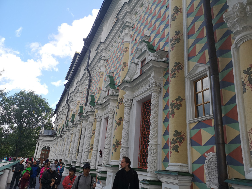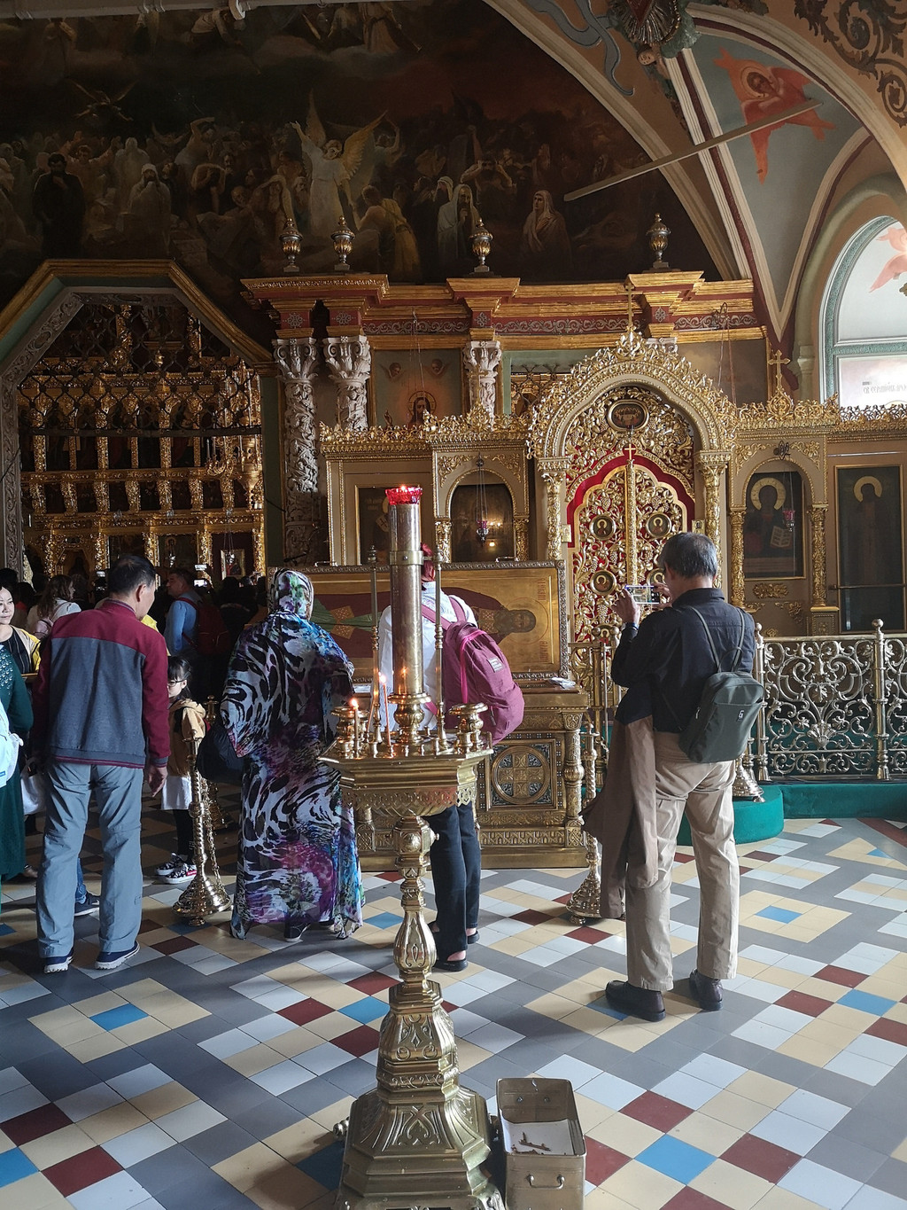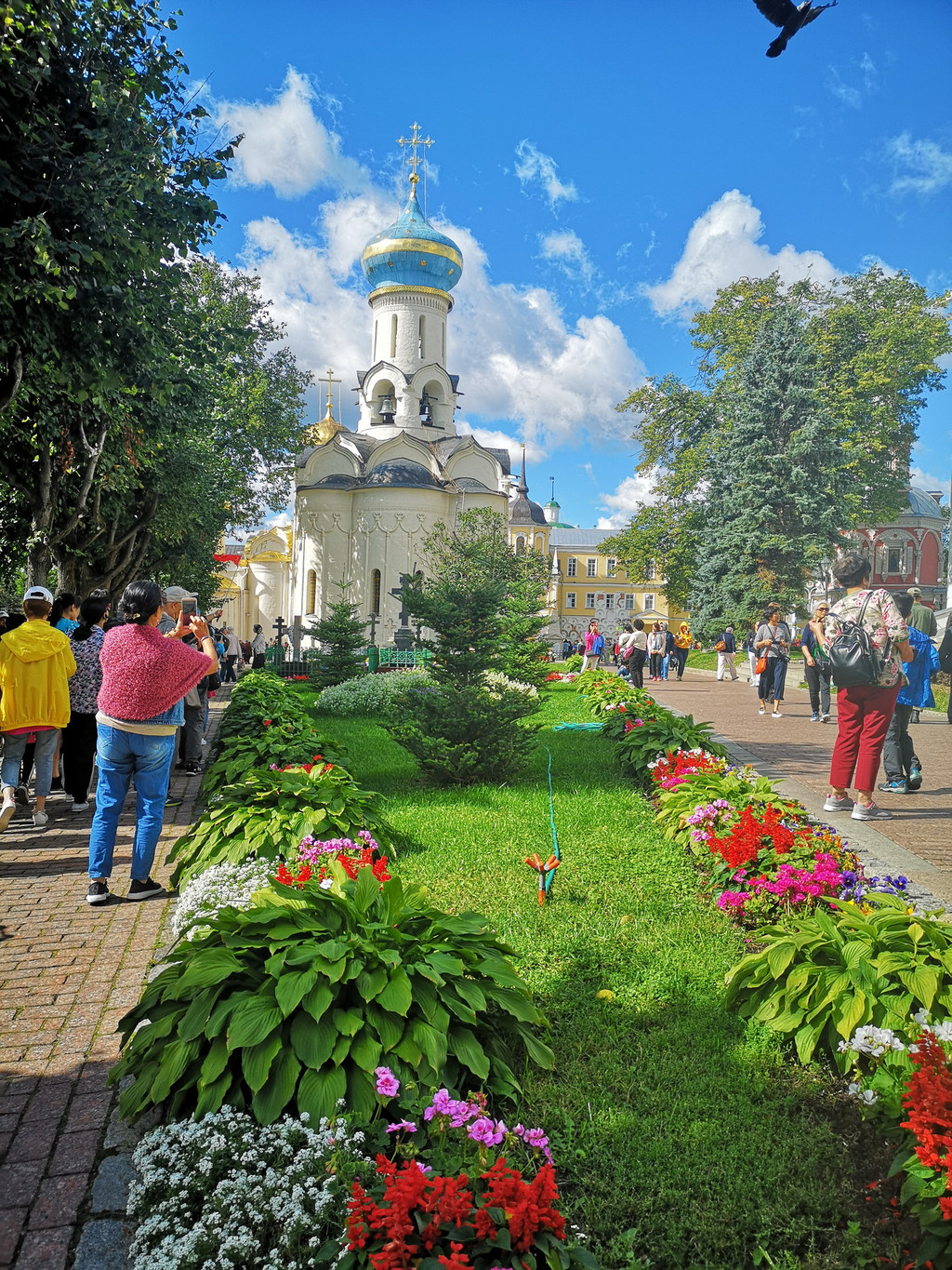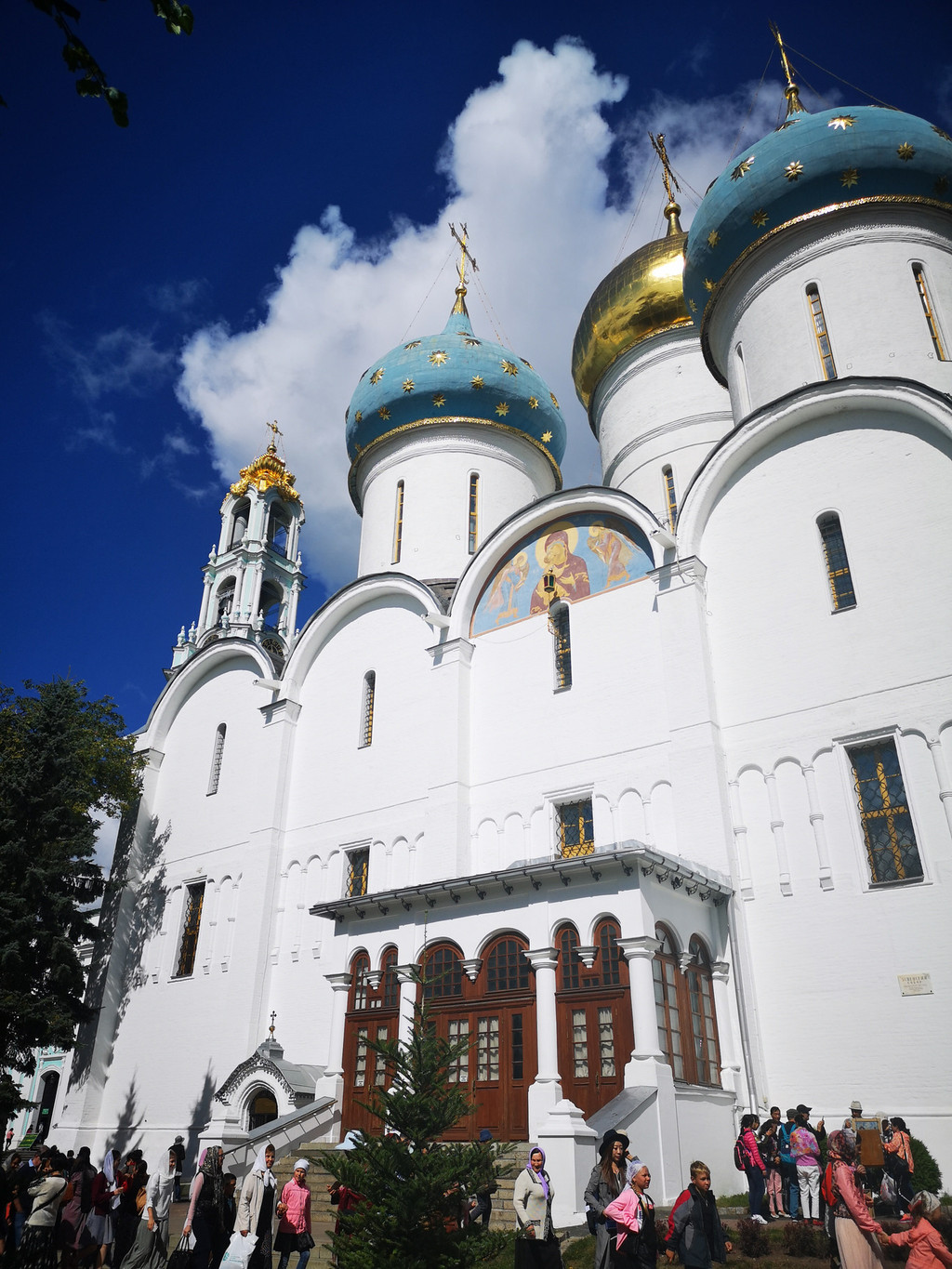 今天是正式俄罗斯旅行的第一天,今天 的行程是早餐后前往位于莫斯科东北70公里处的谢尔盖耶夫镇,造访★圣三一修道院,这是俄罗斯东正教最古老的修道院之一,是俄罗斯东正教会的精神中心。汽车到达修道院,只见门前广场上停满了旅游大巴,游客如织。数不清的鸽子自由飞翔,人们投食、拍照,好不热闹。我们跟随人流进入到修道院内,真是被眼前景象惊到。一座座风格迥异的教堂,环绕在广场四周,每一座教堂屋顶都不相同,洋葱头屋顶的教堂大多鎏金,在阳光和蓝天下特别耀眼醒目;哥特式尖顶屋顶的教堂,装饰繁复,非常美丽;整个修道院的建筑以金色、薄荷绿、湖蓝、白色、砖红、明黄为主。教堂内部的绘画和装饰精美无比,建筑外部的浮雕也让人流连忘返。我们的兴奋程度可想而知,也完全颠覆了在小说中描写中留下的我对修道沉闷、阴森、森严的传统印象。