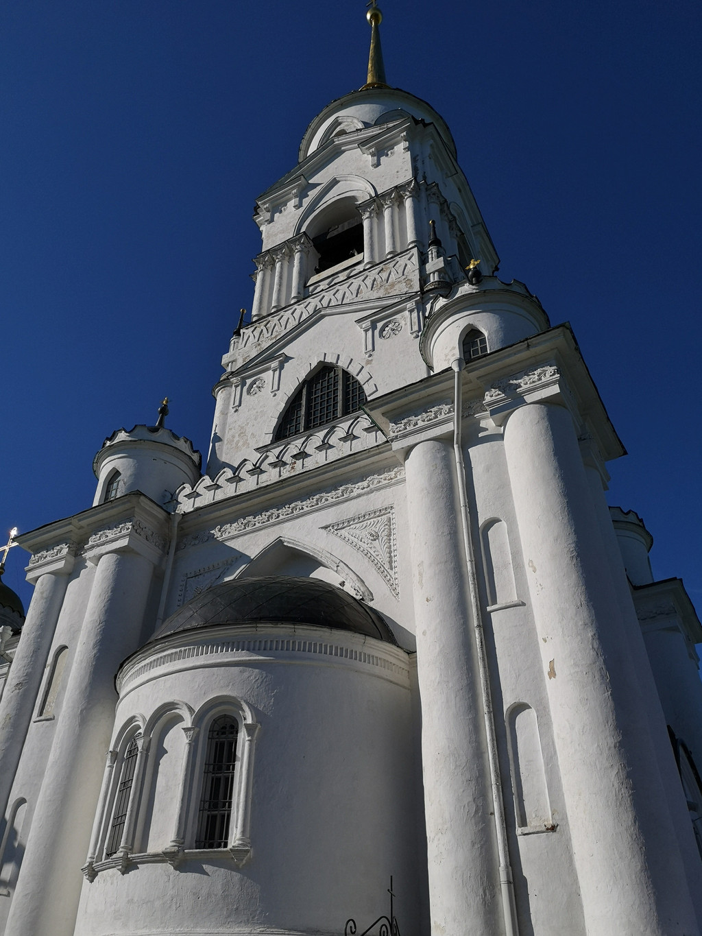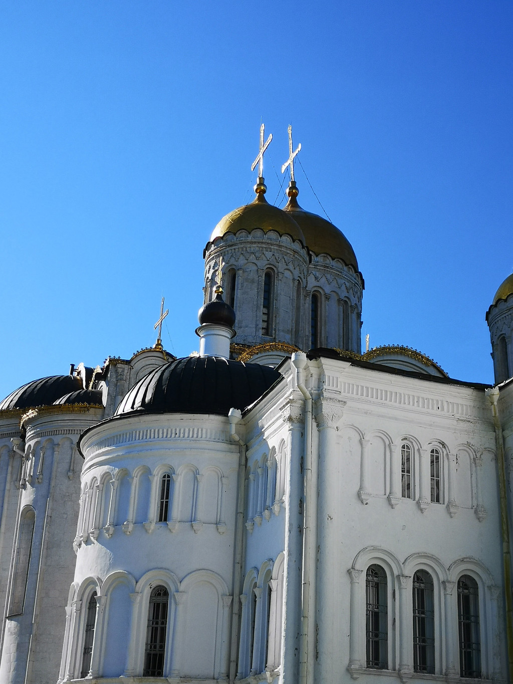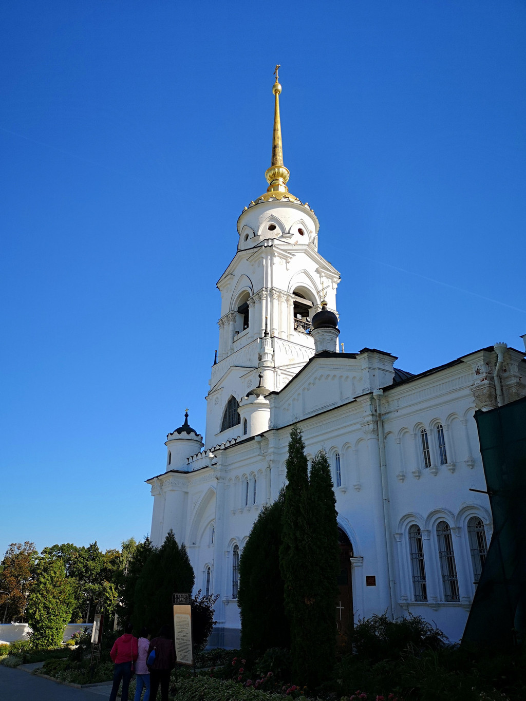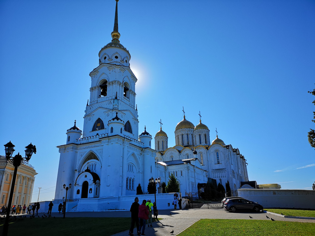 我们去时,不是教堂开放日,因此只能在教堂外面参观。整个建筑由高大的白色石墙、细长而简洁的窗框、金色的弧形屋檐和金色屋顶组成,据说教堂收藏有大量的石刻壁画和绘画,保存许多俄罗斯最古老的圣像,安葬着12-13世纪弗拉基米尔的大公和主教。