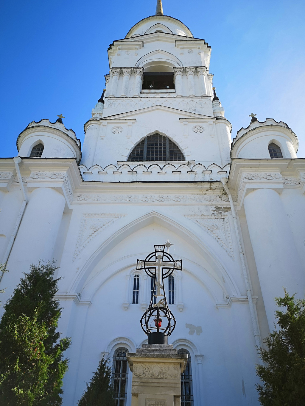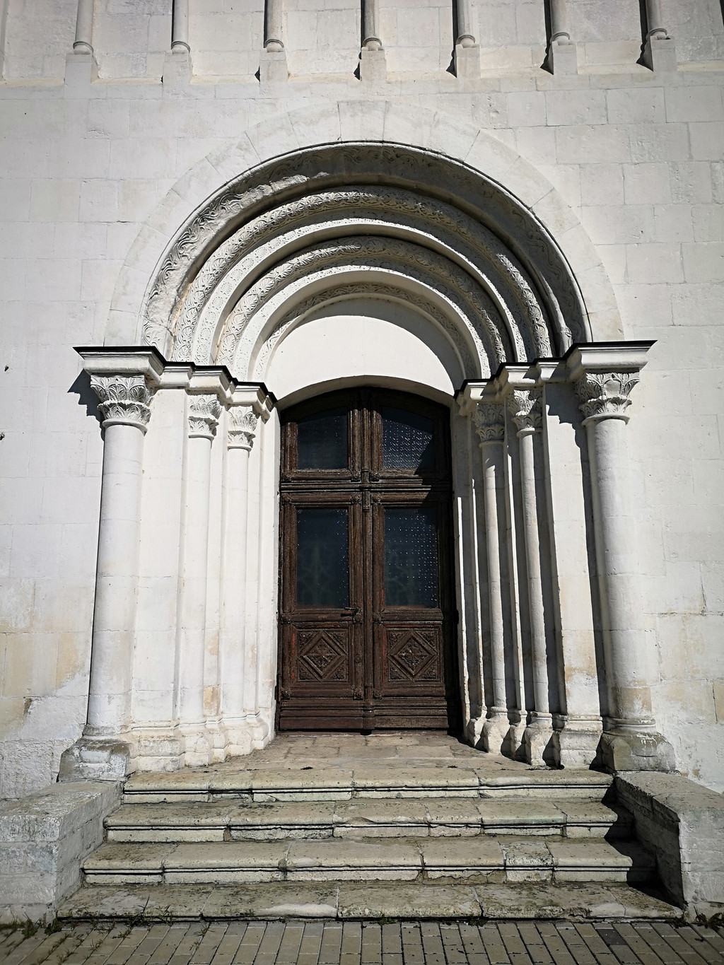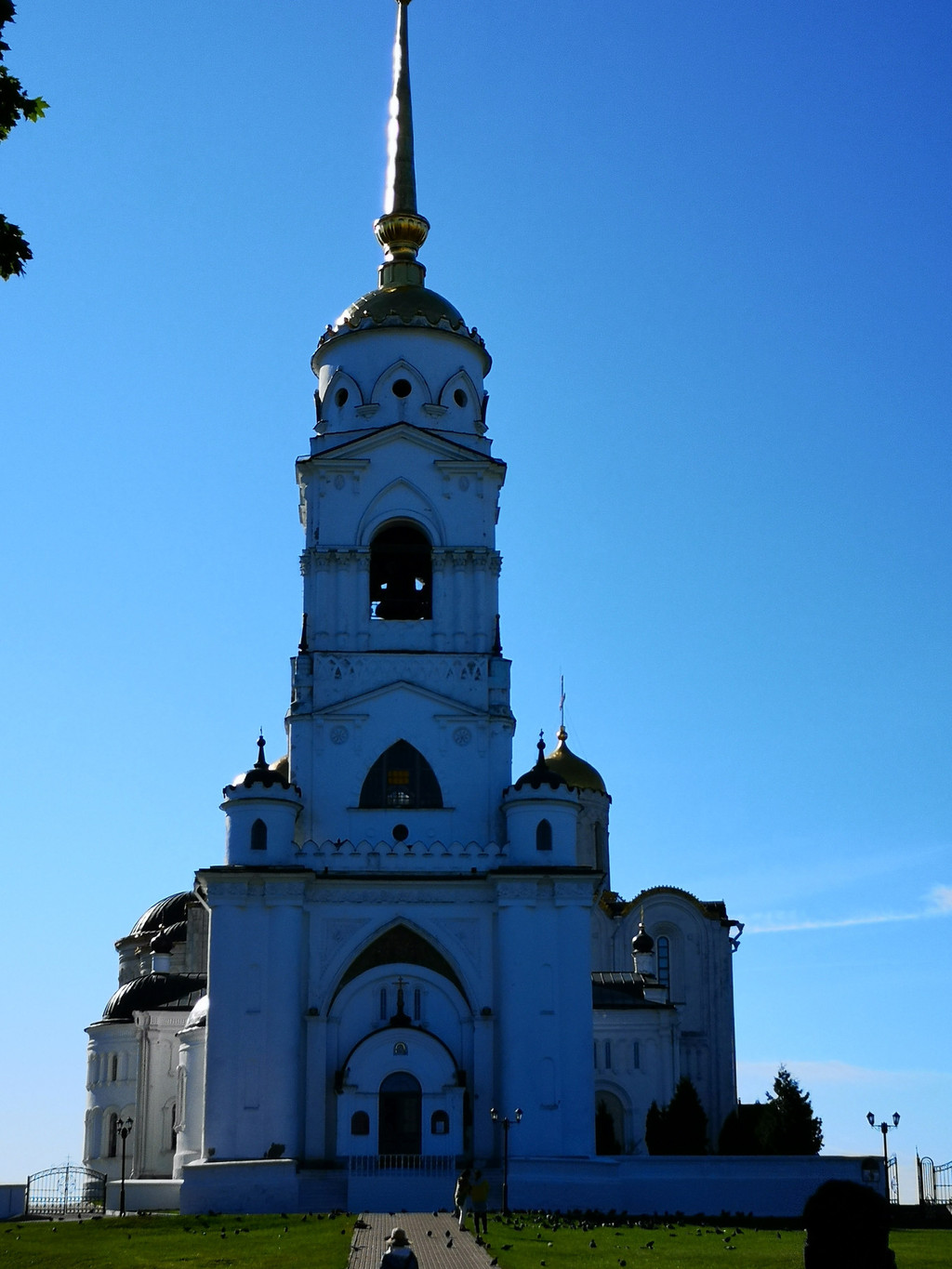 我们去时,不是教堂开放日,因此只能在教堂外面参观。整个建筑由高大的白色石墙、细长而简洁的窗框、金色的弧形屋檐和金色屋顶组成,据说教堂收藏有大量的石刻壁画和绘画,保存许多俄罗斯最古老的圣像,安葬着12-13世纪弗拉基米尔的大公和主教。
