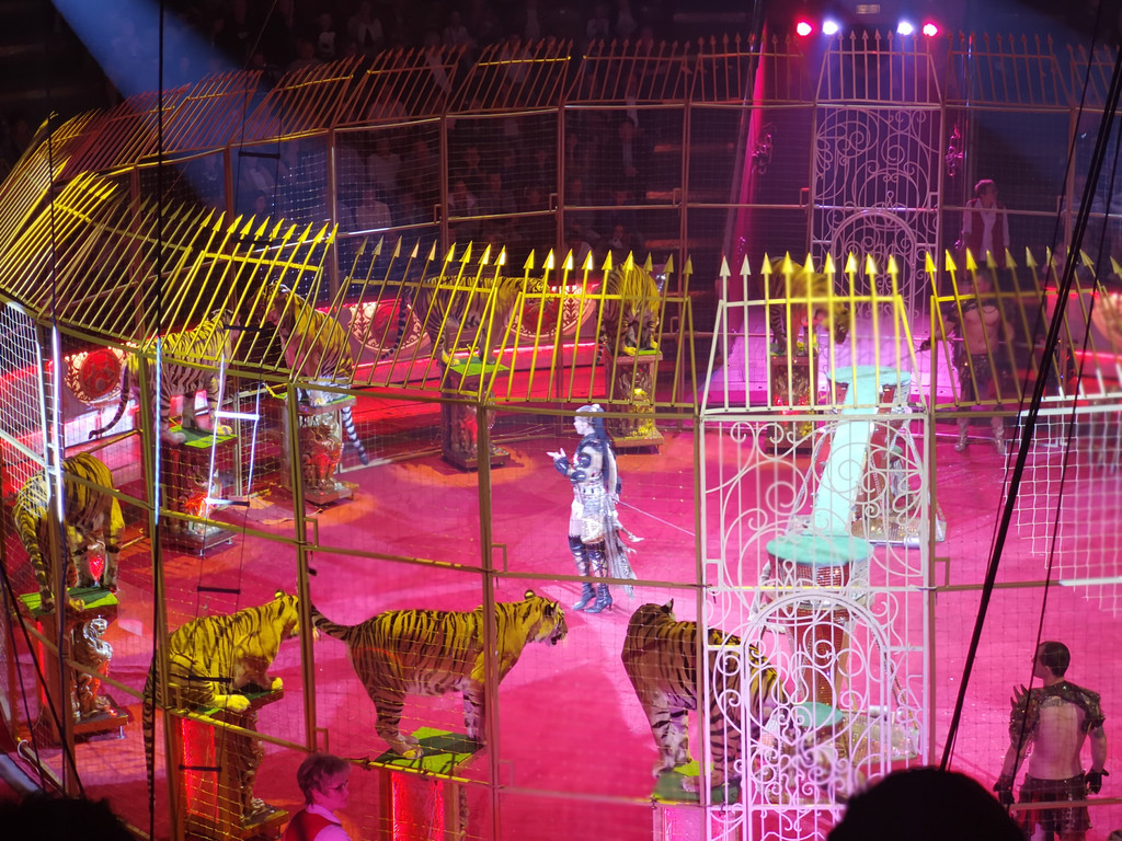 当灯光暗下来,音乐声起时,欢快的小狗、跳跃的骏马、憨态可掬的狗熊、威风凛凛的老虎陆续登场表演;高空走钢丝、空中飞人、流星火球让观众们的心,一会儿提到嗓子眼,一会儿又怦怦乱跳。两小时的表演眨眼就到,观众们直呼过瘾。