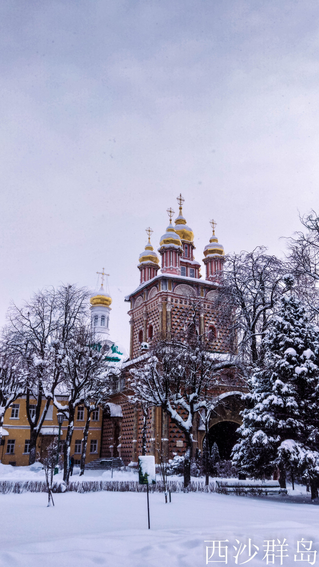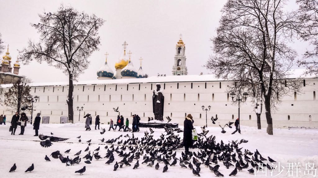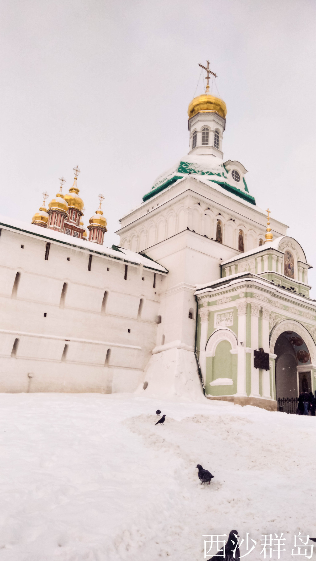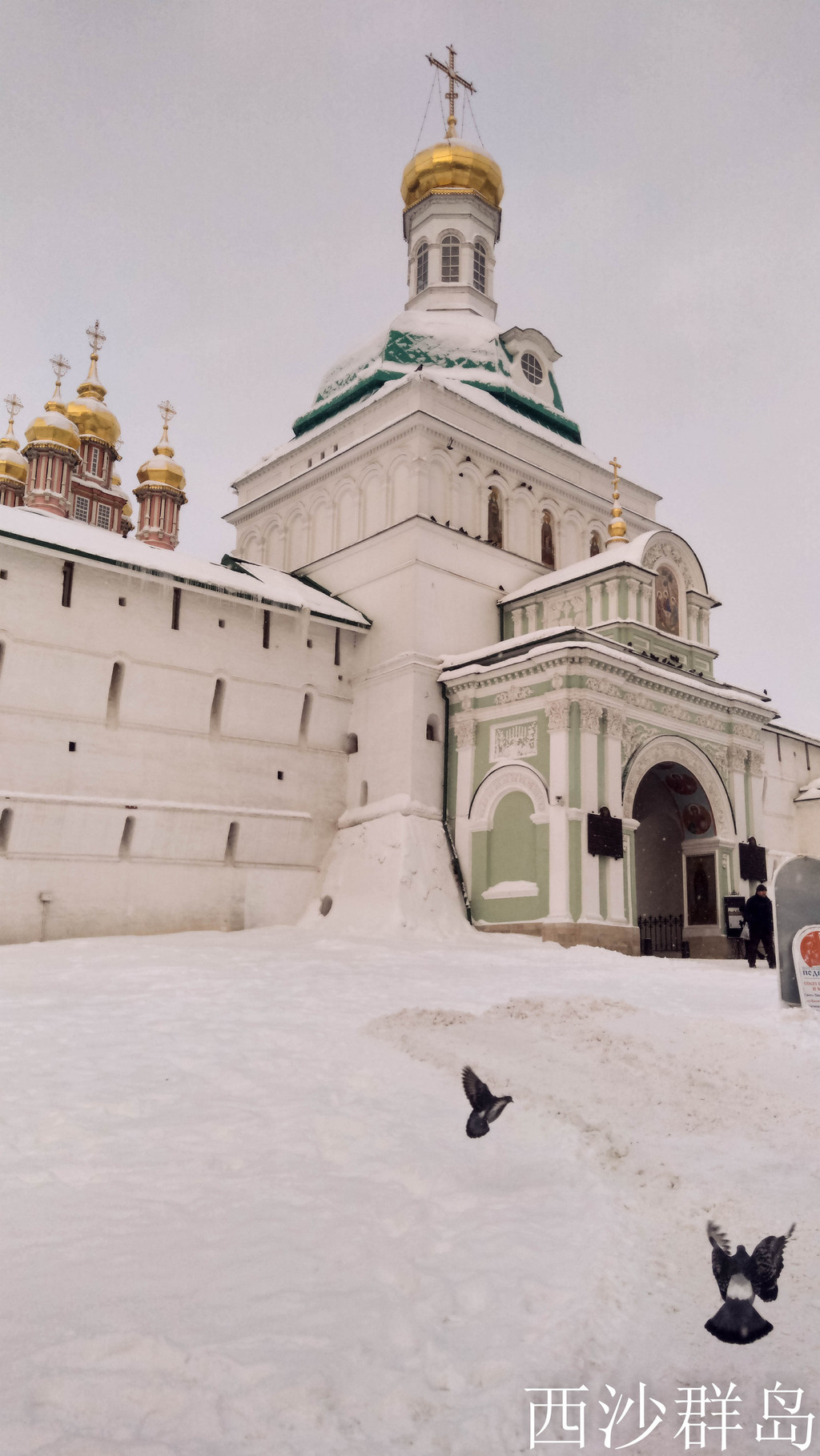 广场右侧修道院围墙外伫立一排东正教圣人的雕像,隆起的雪堆冰雕,围墙内亮眼的金色洋葱头,蓝色洋葱头!满天飞舞的鸽子!