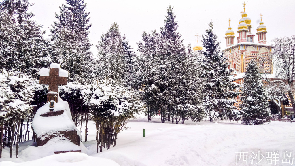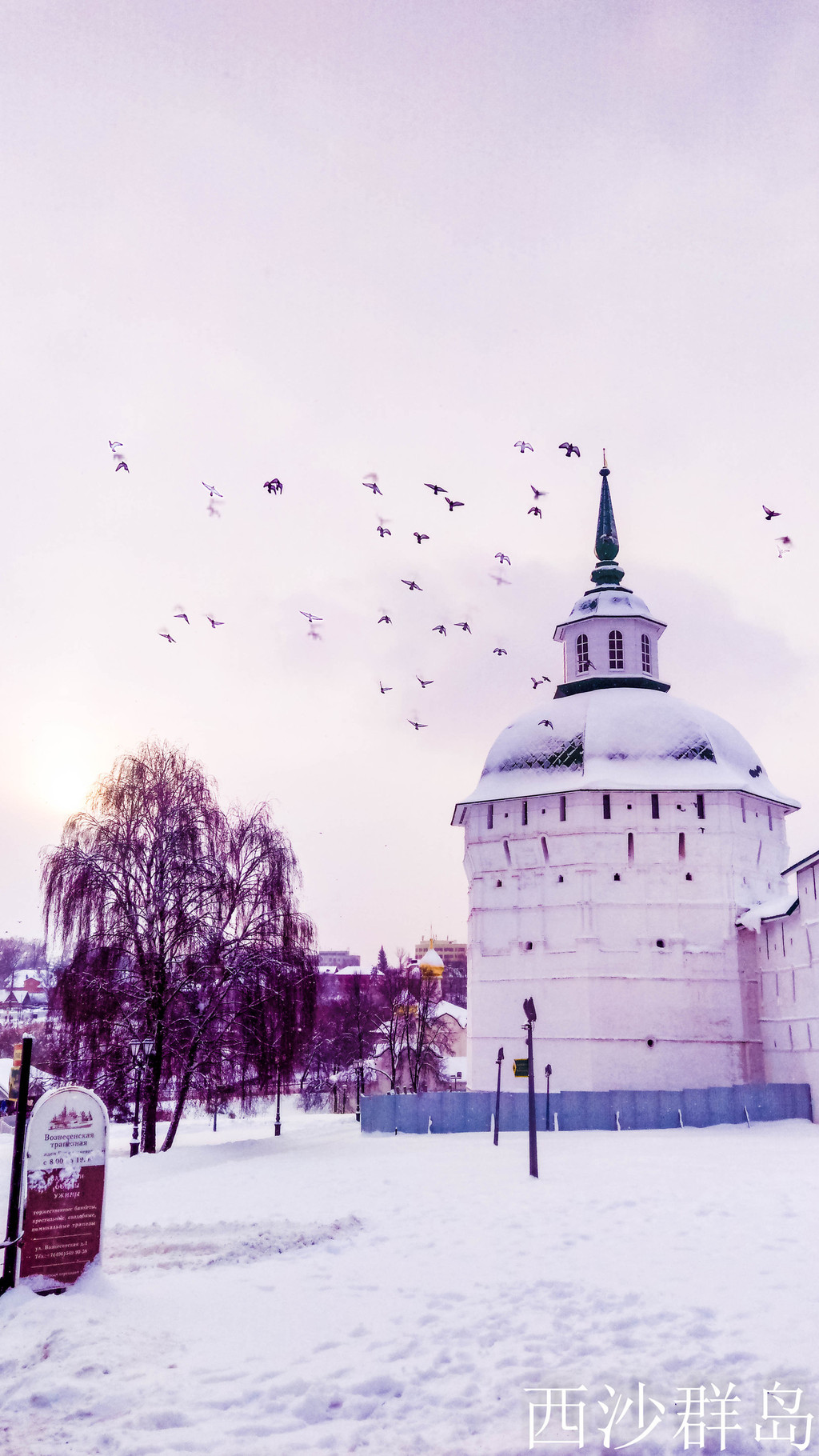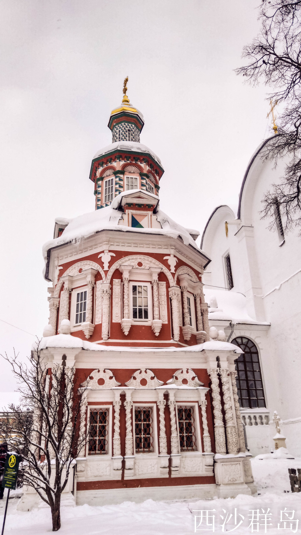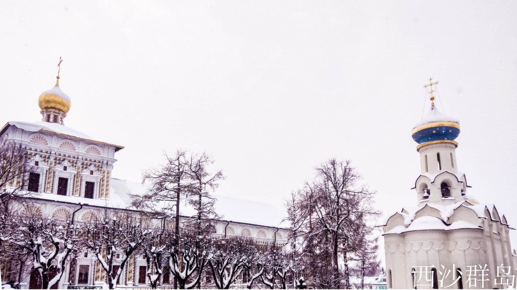 广场右侧修道院围墙外伫立一排东正教圣人的雕像,隆起的雪堆冰雕,围墙内亮眼的金色洋葱头,蓝色洋葱头!满天飞舞的鸽子!